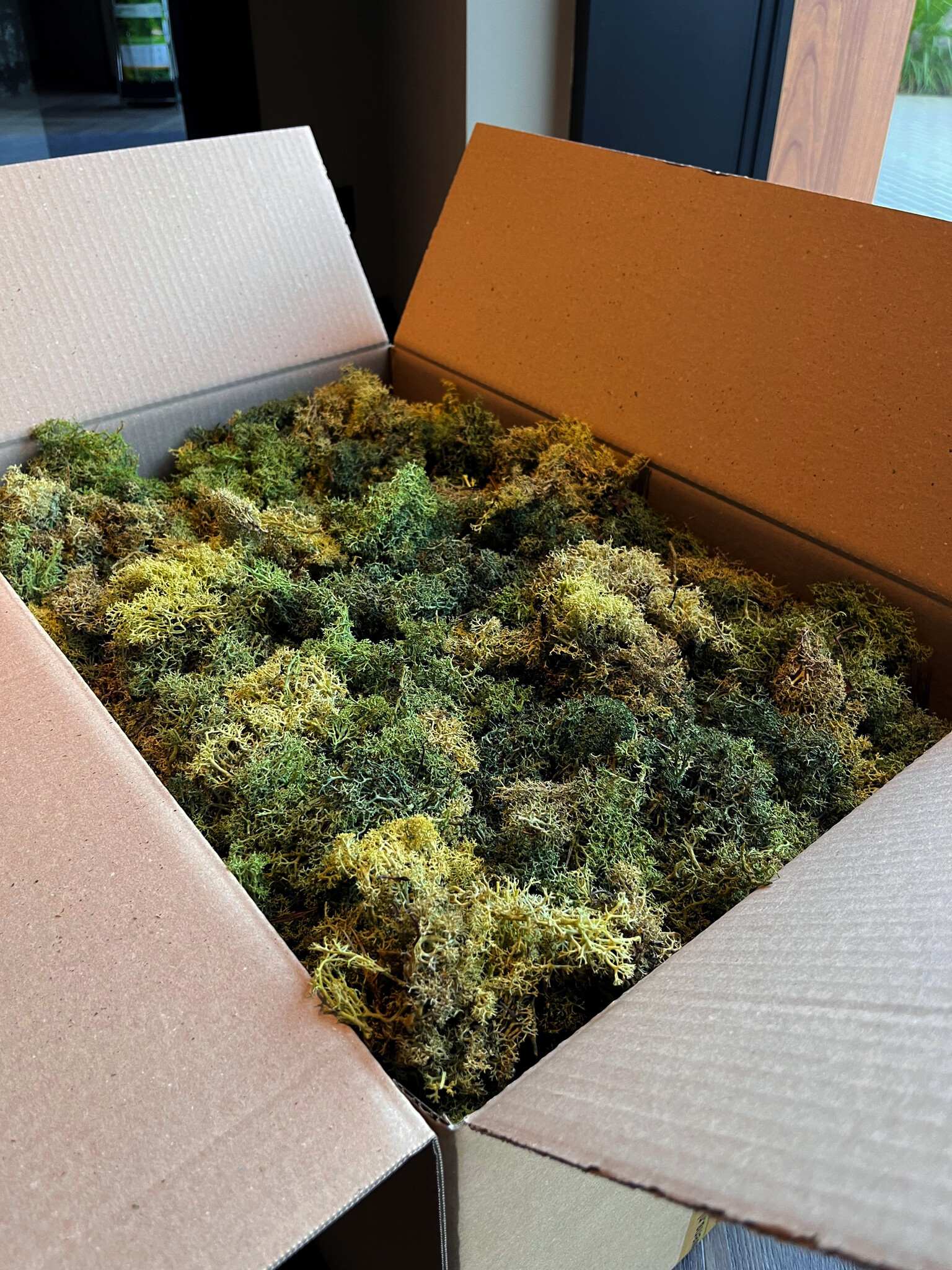 In deze L doos van 60x40x10 cm zit ECO mos. Goed voor het maken van 0.20-0.35 m². Dit is afhankelijk van hoe 'vast' u het mos wilt verwerken en hoe 'kieskeurig' u het geleverde mos selecteert en verwerkt. Tijdens het gebruik van dit volledige mos komen er van nature aanwezige kleurschakeringen terug. In de ECO dozen zitten minder 'mos kopjes' dan in de Rendiermos dozen. Wilt u een strakke moswand, kies dan voor de normale rendiermos dozen. Mag de wand een wildere uitstraling krijgen en bent u prijsbewust dan zijn onze ECO L dozen geschikt voor uw project. U kunt ook kiezen voor een mix waarin verschillende tinten met elkaar gemixt zijn voor een speelser en variërend effect.
