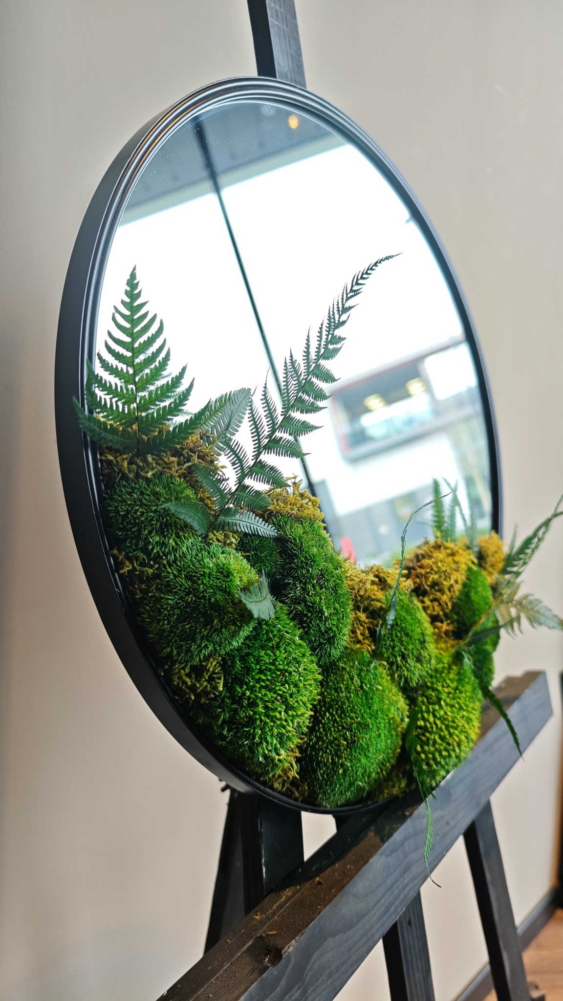 Deze ronde jungle spiegel bevat een subtiel accent van mos en varens. De combinatie geeft de spiegel een luxe uitstraling met een frisse junglesfeer die niet overheerst. Het ontwerp brengt rust en diepte in elke ruimte en past perfect in de hal, woonkamer of slaapkamer. De natuurlijke materialen blijven langdurig mooi en zijn volledig onderhoudsvrij.