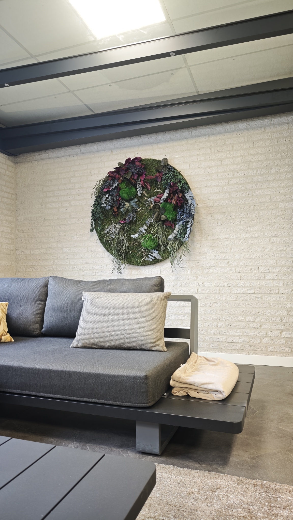 Met een rond jungleschilderij wordt een strak interieur doorbroken. Wist u dat onze ronde junglecirkels met stalen rand erg goed staan in een industrieel interieur? De zachte, natuurlijke uitstraling van het mos, planten, varens en bladeren geeft een mooie aanvulling op de vaak ‘harde’ toegepaste materialen zoals beton, staal en glas.