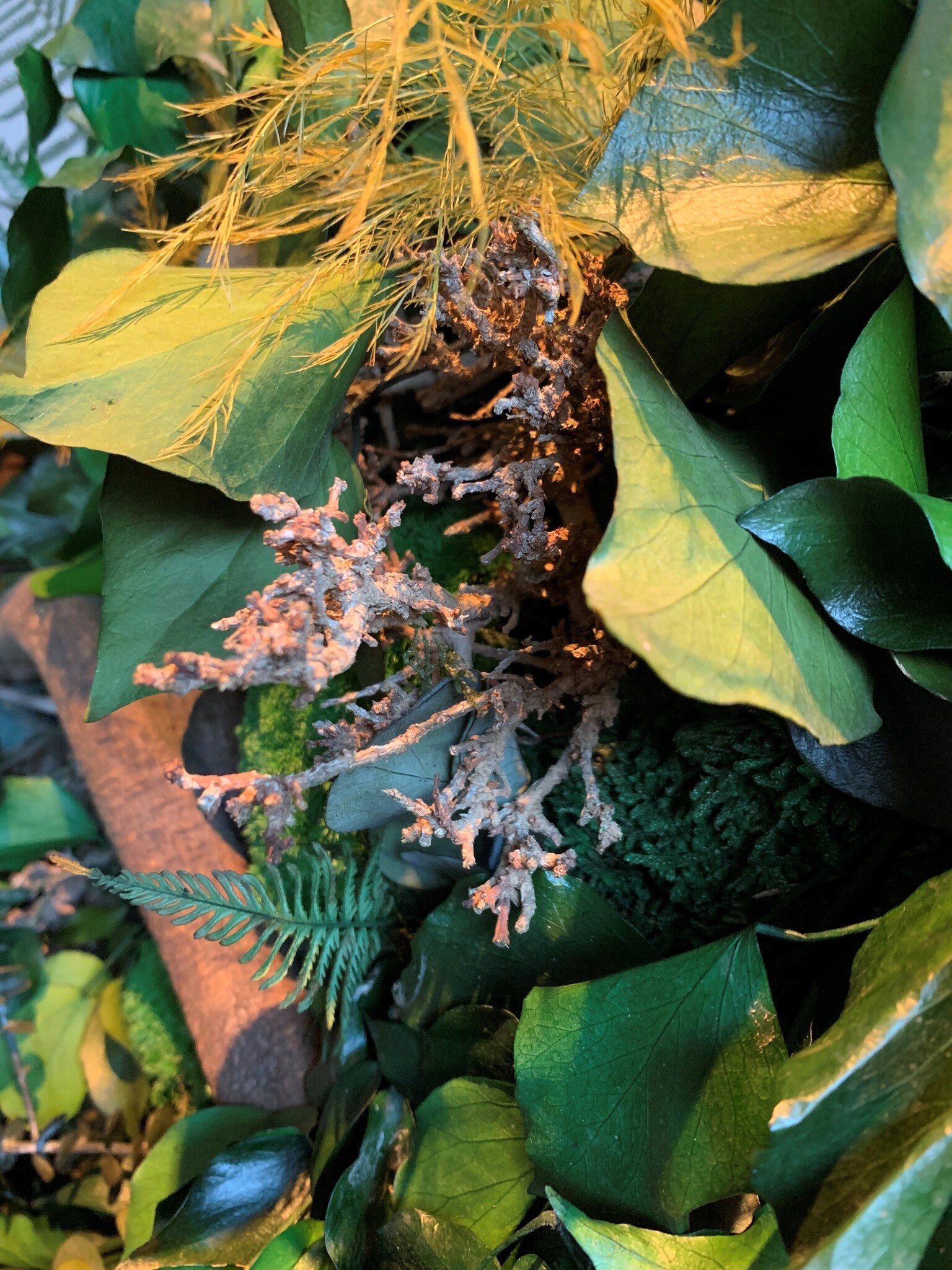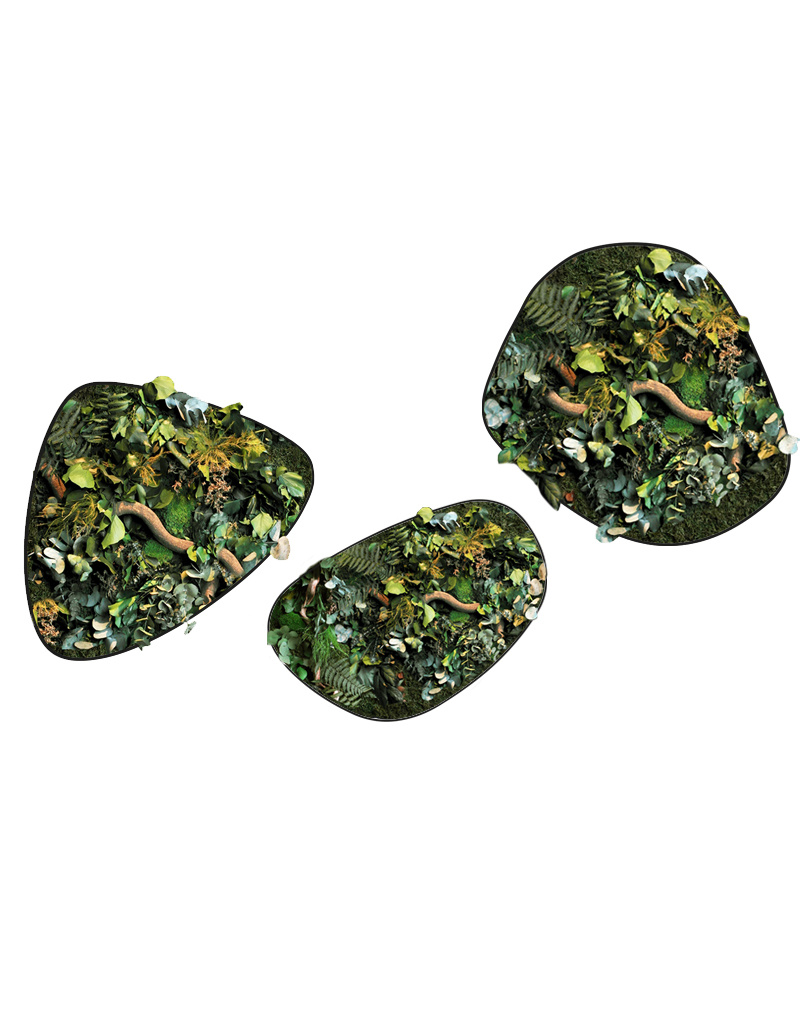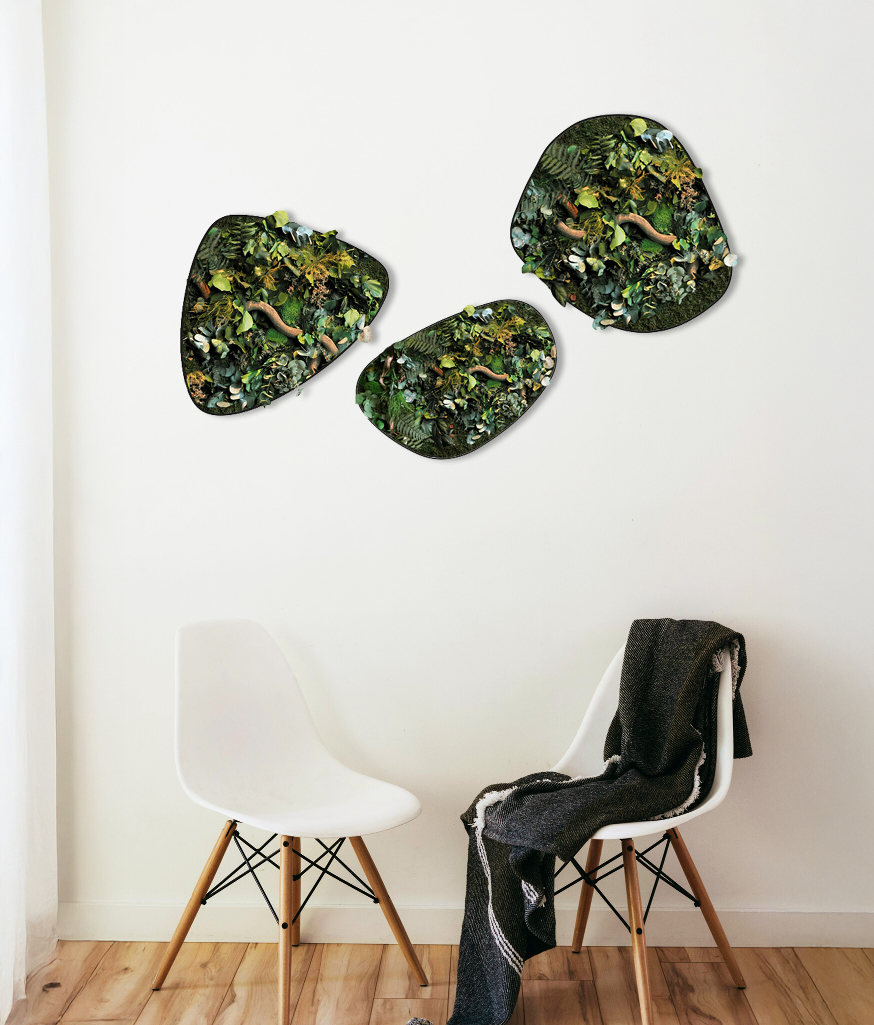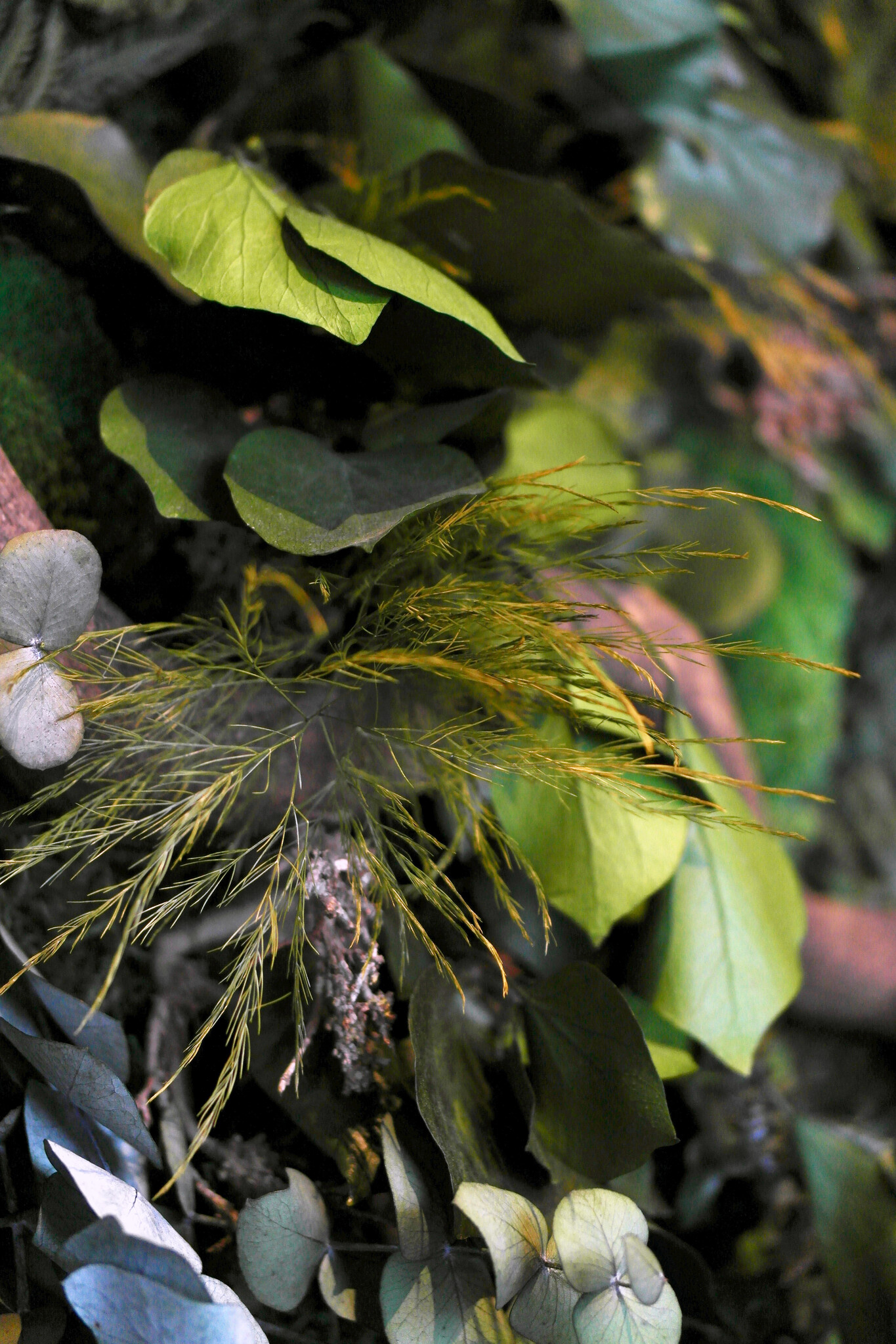 Jungle variant Java bevat verschillende soorten bladeren en varens in combinatie met een houten liaan. De grijzen accenten die in het schilderij voorkomen zorgen voor een mooi contrast met de donkergroene achtergrond van platmos. Net zoals het mos zijn ook de jungle bladeren geprepareerd wat ervoor zorgt dat het jungle schilderij jaren lang mooi blijft.