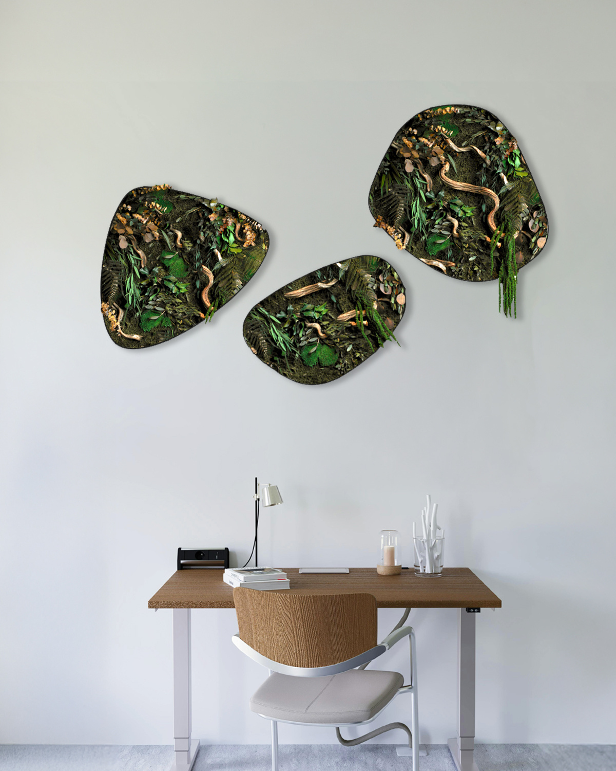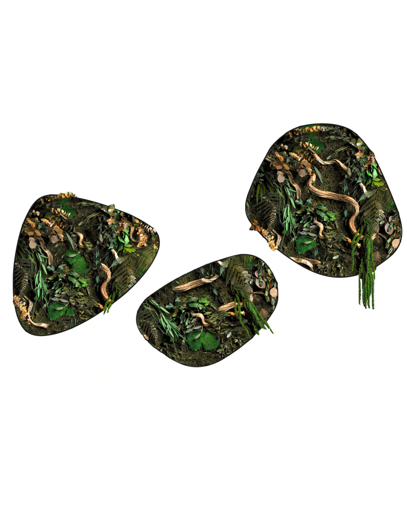Jungle variant Liana heeft een stoer uiterlijk met verschillende houten details. Het donkere mos op de achtergrond zorgt voor een mooi contrast op de diversiteit van bladeren en varens. Net zoals het mos zijn ook de jungle bladeren geprepareerd wat ervoor zorgt dat het jungle schilderij jaren lang mooi blijft.