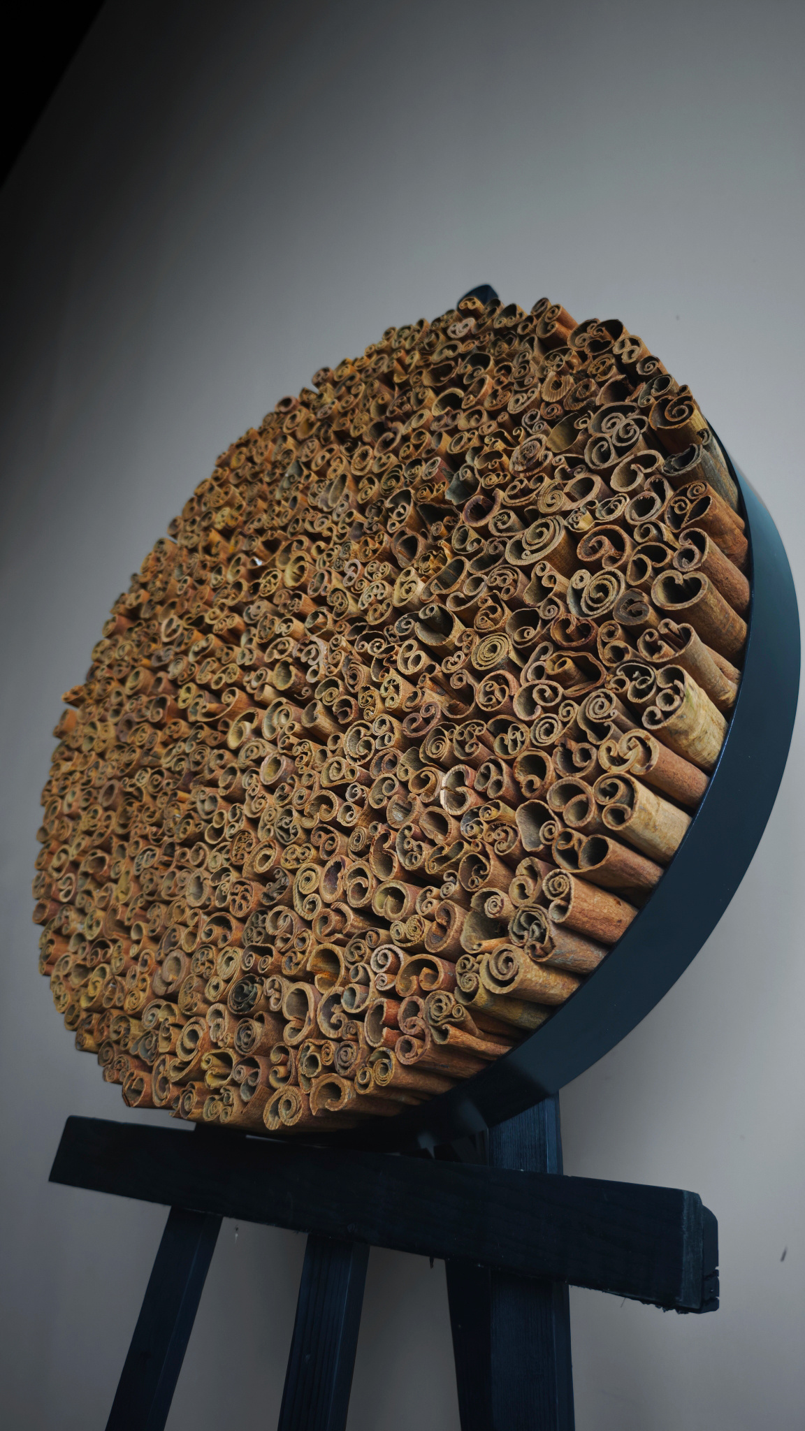 De kaneelcirkel op de foto heeft een diameter van 60 cm en weegt tussen de 15 en 20 kg. Het schilderij is opgebouwd uit een houten onderplaat, omringd door een hoogwaardige, gepoedercoate zwarte stalen rand. De kaneelstokjes steken buiten de lijst uit wat het schilderij een indrukwekkende diepte geeft met een totale dikte van 12 cm.