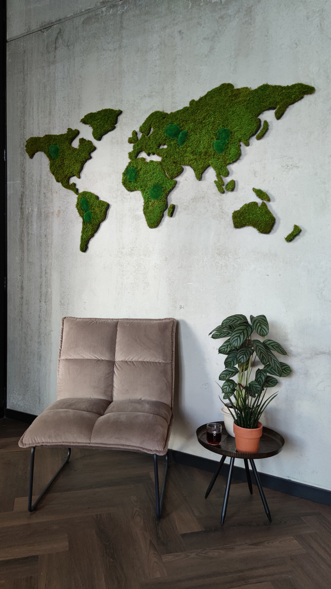 Op zoek naar een echte eyecatcher? Deze wereldkaart in platmos licht, gecombineerd met bolmos op de gebergte, brengt een frisse groene sfeer in je huis. Het lichte mos geeft een luxe uitstraling, terwijl het bolmos de bergen extra benadrukt voor een levendig effect.