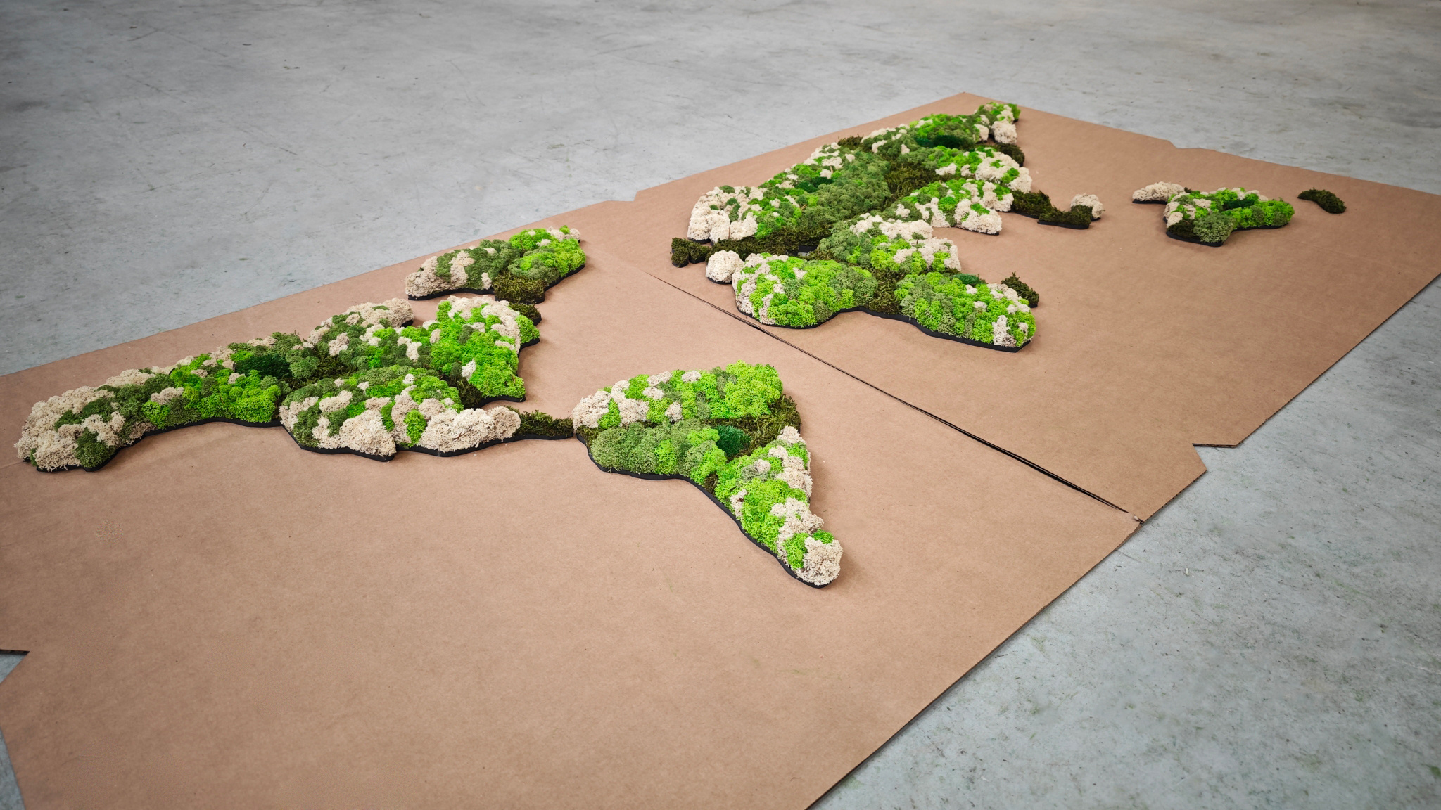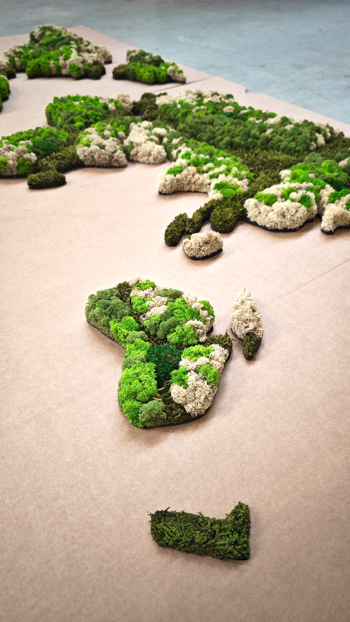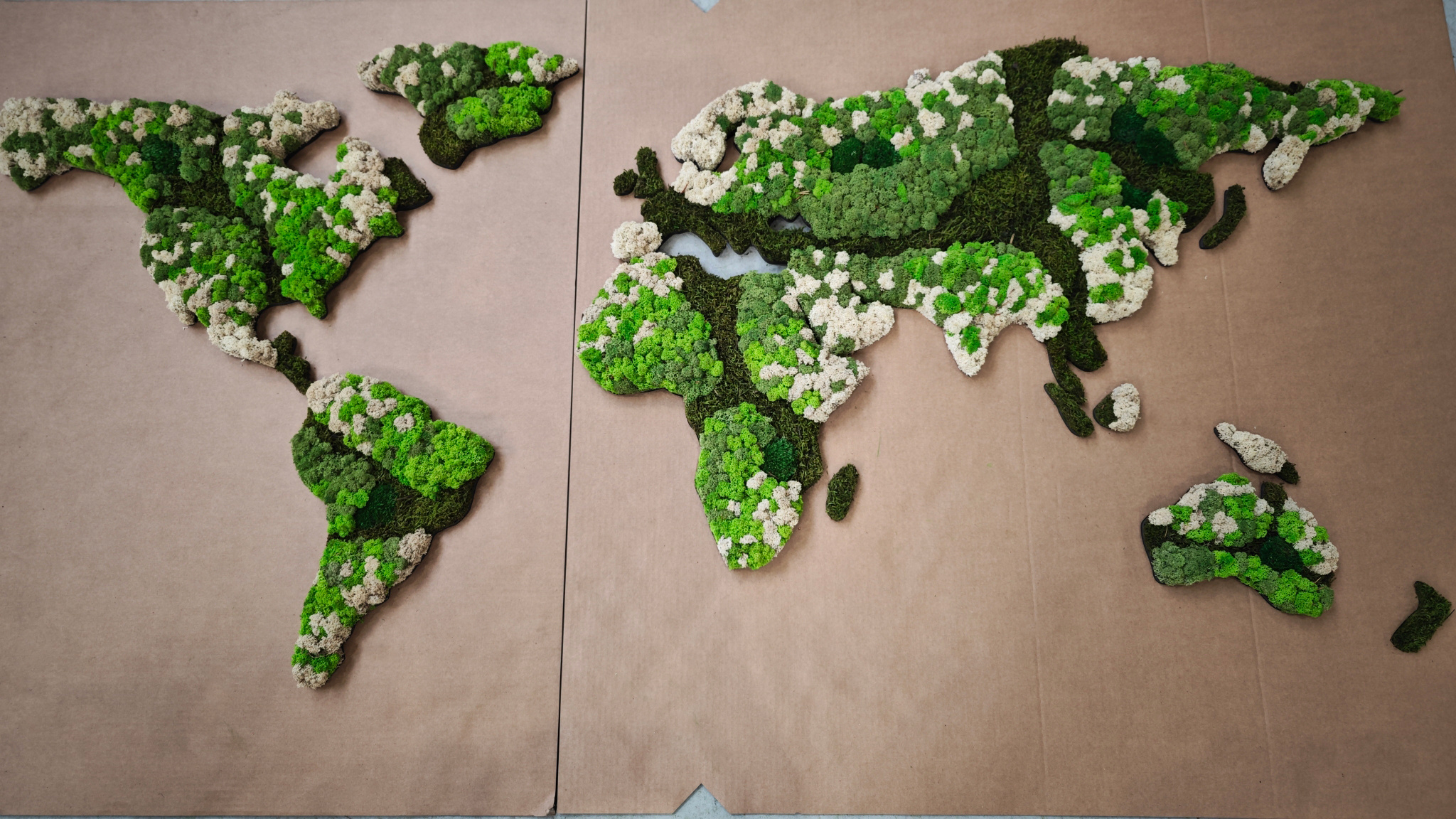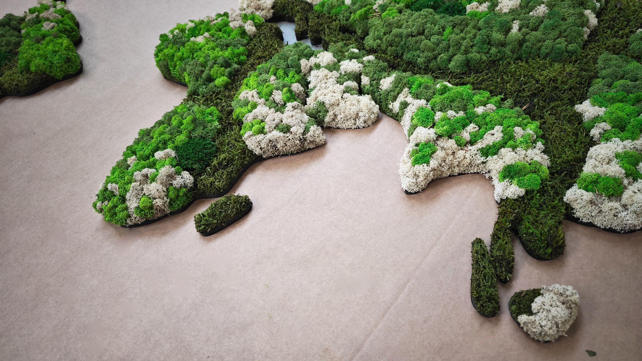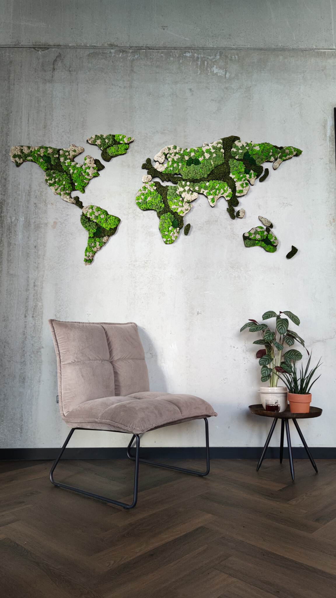 Deze unieke wereldkaart van mos is gemaakt van twee soorten mos. Rendiermos met de felgroene accentkleur Pacem Light, en licht gekleurd platmos. Het samenspel van deze mossen creëert een frisse en vrolijke eyecatcher. Perfect boven de bank, in de keuken of in een ontvangstruimte, brengt deze wereldkaart een levendige groene sfeer in uw interieur.