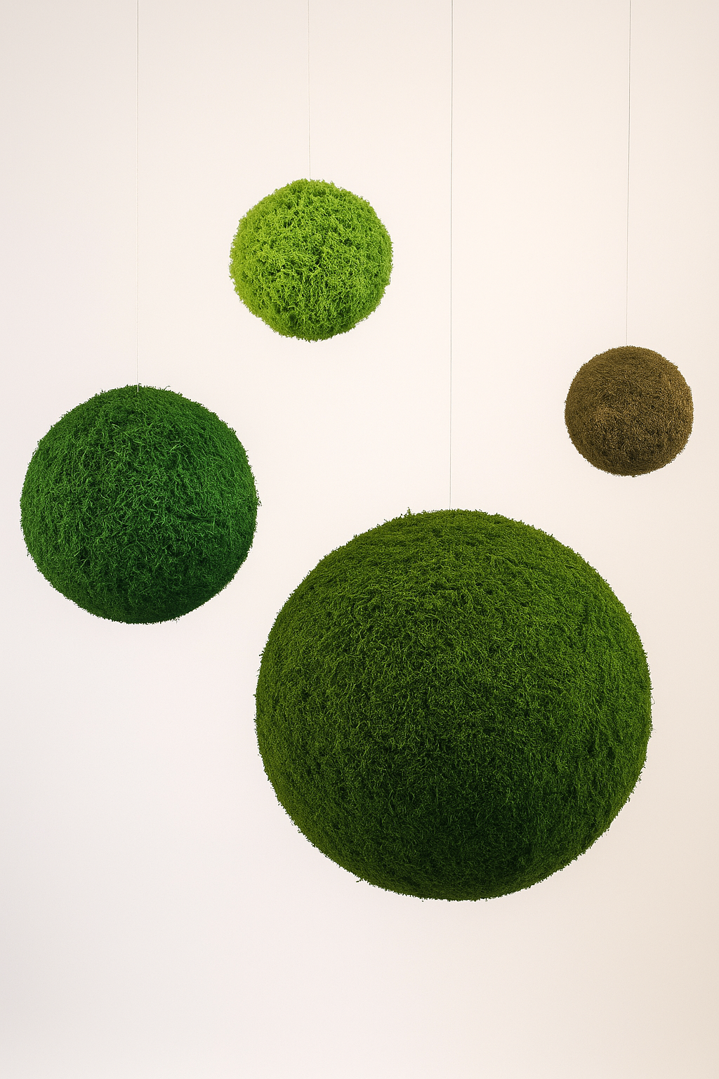 Hangende mosbol van platmos– natuurlijke akoestiek en stijl aan het plafond