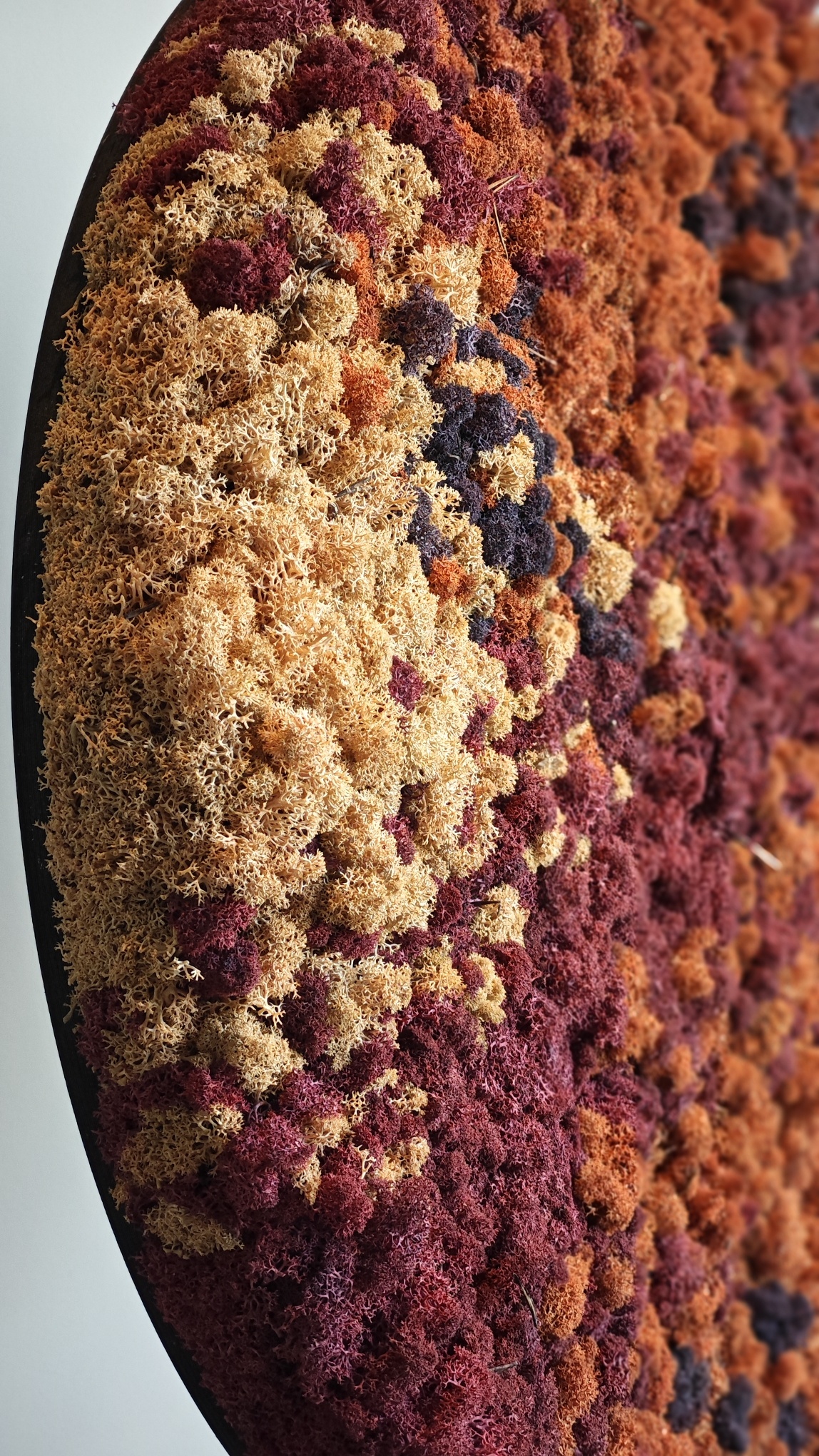 Mosschilderij Autana is een echte eyecatcher die breekt met de traditionele groene moscreaties. In plaats van groen straalt dit kunstwerk warmte en diepte uit, dankzij een unieke mix van kleuren: het vurige Persici, de lichte tinten van Naturalis, het zachte Casia en het diepe Bordeaux. Samen creëren ze een expressief en levendig geheel dat elke ruimte een krachtige en stijlvolle uitstraling geeft.