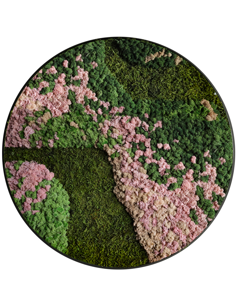 Deze ronde moscirkel is een harmonieus samenspel van natuurlijke structuren, kleuren en diepte. In dit mosschilderij ontvouwt zich een organisch landschap dat direct de aandacht trekt. De compositie is opgebouwd uit verschillende soorten mos, elk met een eigen textuur en kleurintensiteit. Licht platmos vormt een rustige basis en zorgt voor een gevoel van stabiliteit en diepte.