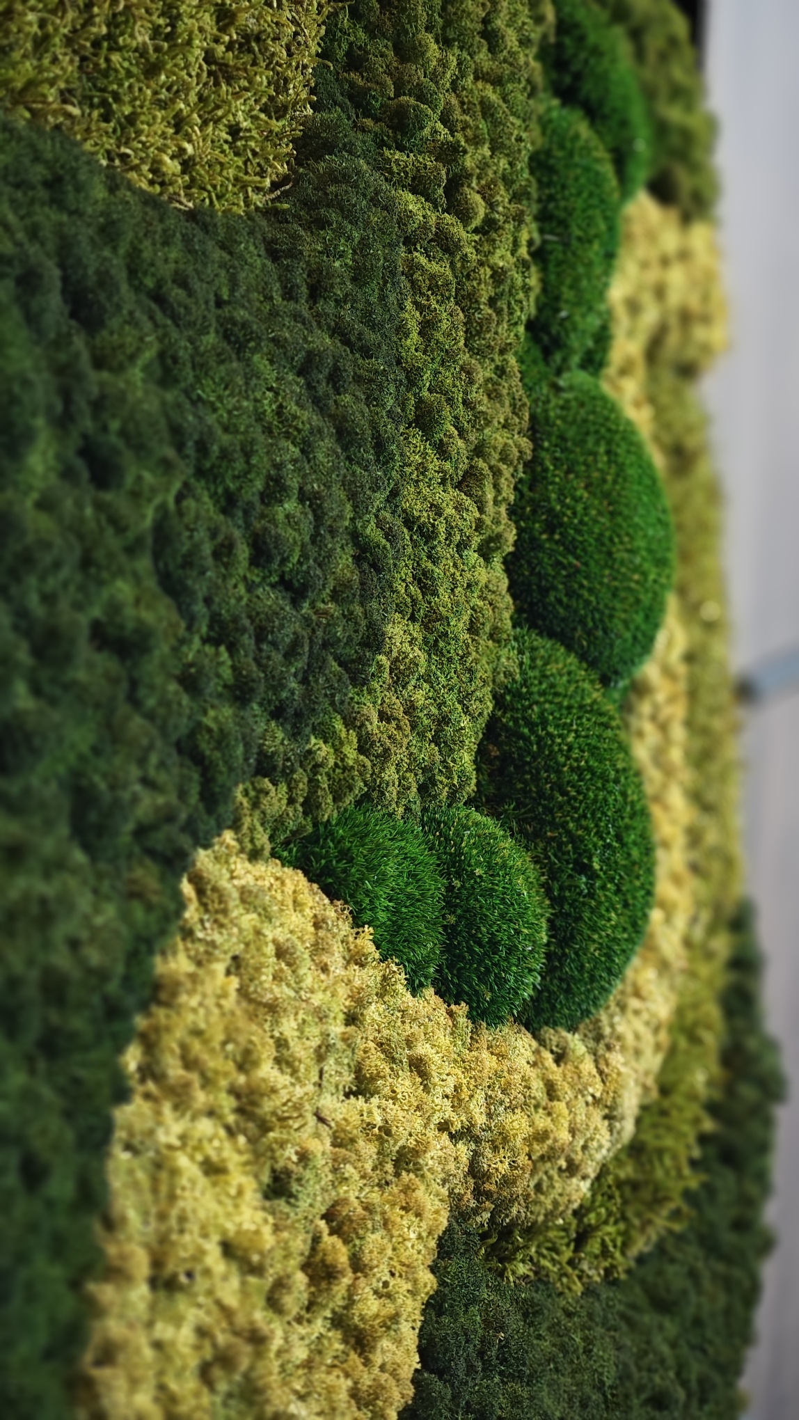 Het toegepaste mos is een 100% natuur product en heeft 0% onderhoud nodig. Een van de eigenschappen en voordelen zijn; hoge akoestische demping, brandvertragend (geïmpregneerd), zeer kleur vast, geen daglicht nodig, vuil afstotend (antistatisch) en omdat het mos niet meer leeft heeft het geen onderhoud nodig zoals water geven, snoeien of bemesten. De moscreaties zijn mooi en zacht om aan te raken en hebben een grote aantrekkingskracht. Onze mossen zijn van de hoogste kwaliteit wat zorgt voor een zéér lange levensduur (10-20 jaar).