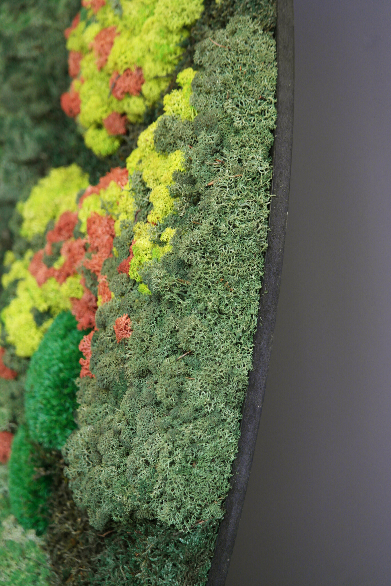 Mosschilderij Kaisa is een prachtig mosschilderij dat op een unieke wijze de natuur in huis brengt. Dit mosschilderij bestaat uit een mossenmix van platmos, bolmos en rendiermos. Door het gebruik van de twee levendige accentkleuren Persici-rood en de heldergroene kleur ontstaat er een levendig mosschilderij. Het diepe contrast in het mosschilderij wordt benadrukt door het donkere platmos. Perfect voor een vleugje natuur in elke ruimte!
