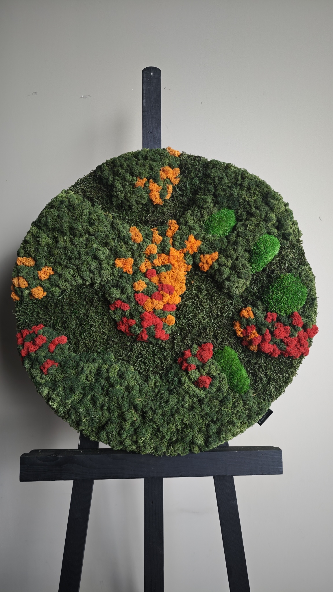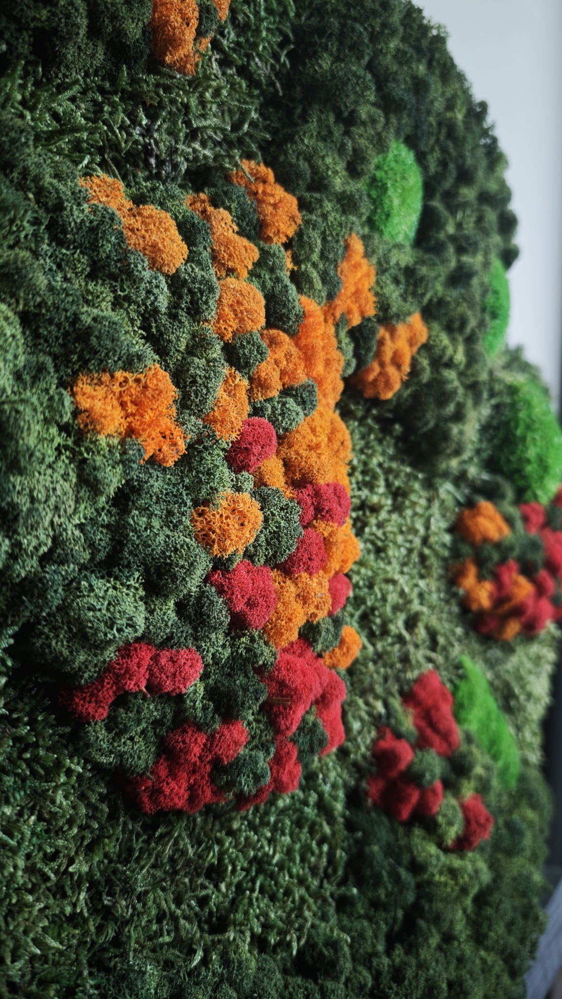 Haal de natuur naar binnen met mosschilderij Pepper, waarbij de diepe groentinten zijn gecombineerd met subtiele accenten van rood en oranje. Het resultaat is een levendige en elegante uitstraling. Dit natuurlijke kunstwerk voegt een rustgevende, maar ook levendige en chique sfeer toe aan elke ruimte.
