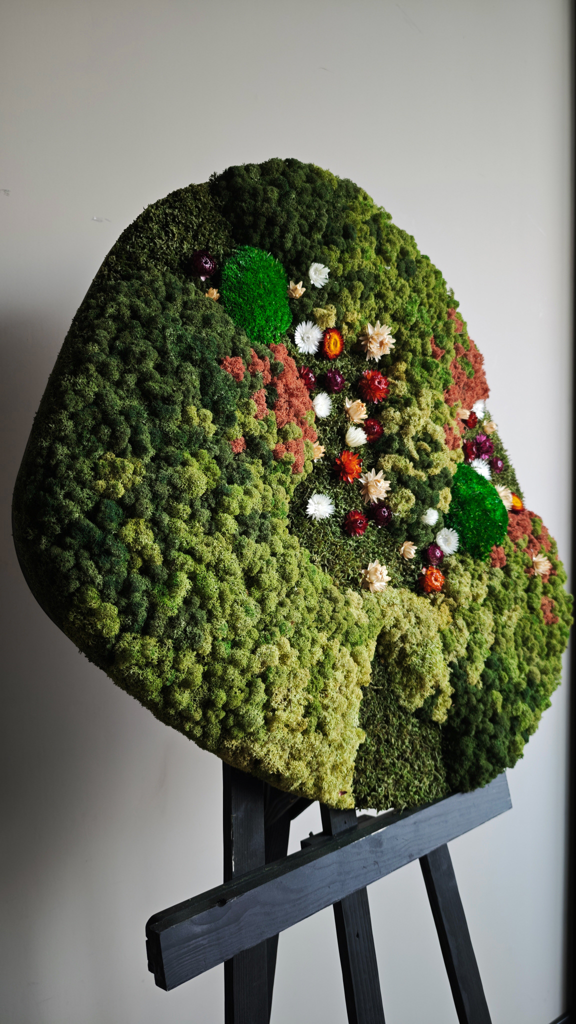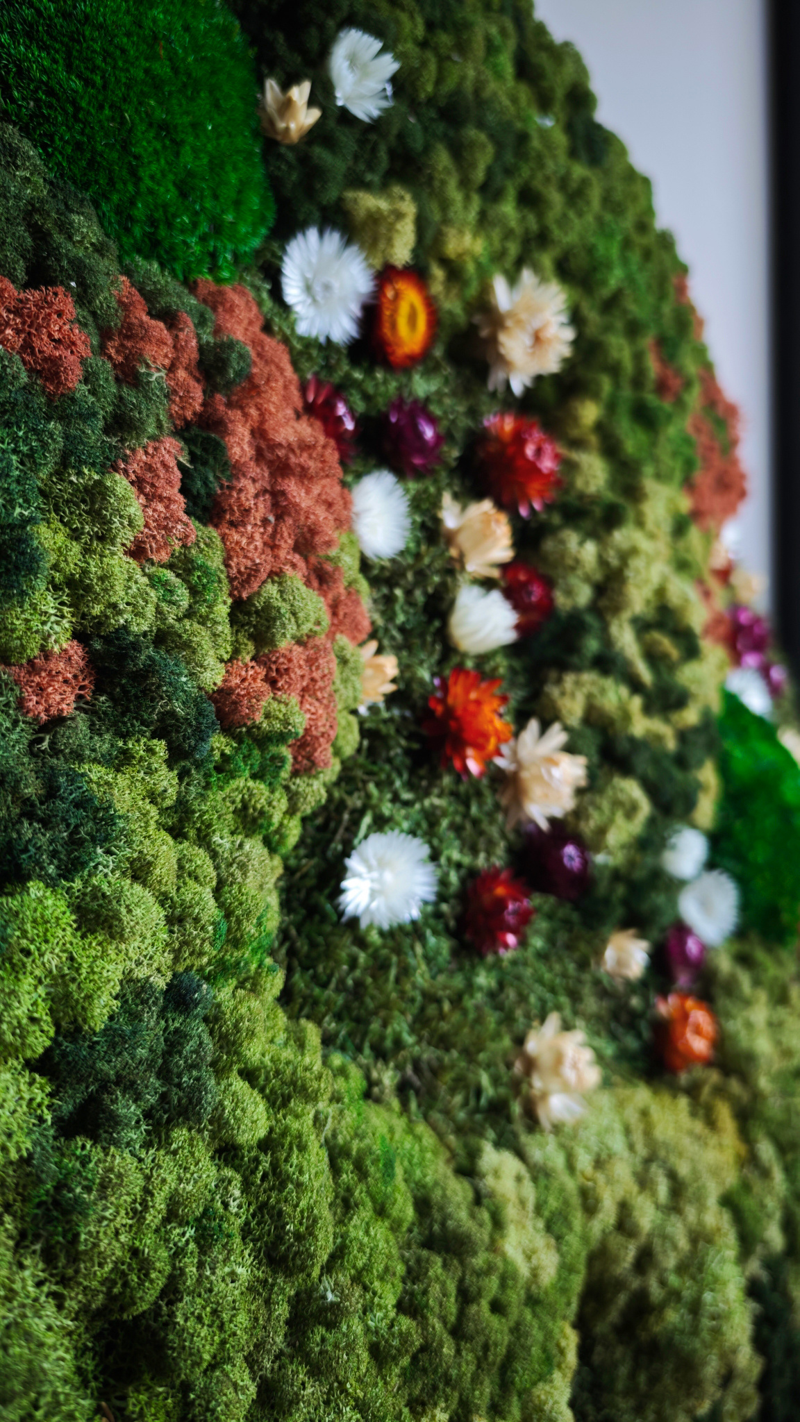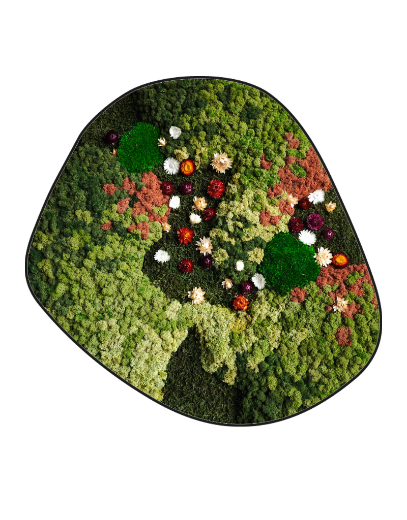 In mosschilderij Avalon zitten diverse mossoorten gecombineerd met vrolijke, gekleurde droogbloemen in het wit, oranje en donkkerrood. Perfect voor wie zijn interieur een frisse en vriendelijke touch wil geven. Maak met dit mosschilderij een statement en voeg iets unieks toe aan uw muur.