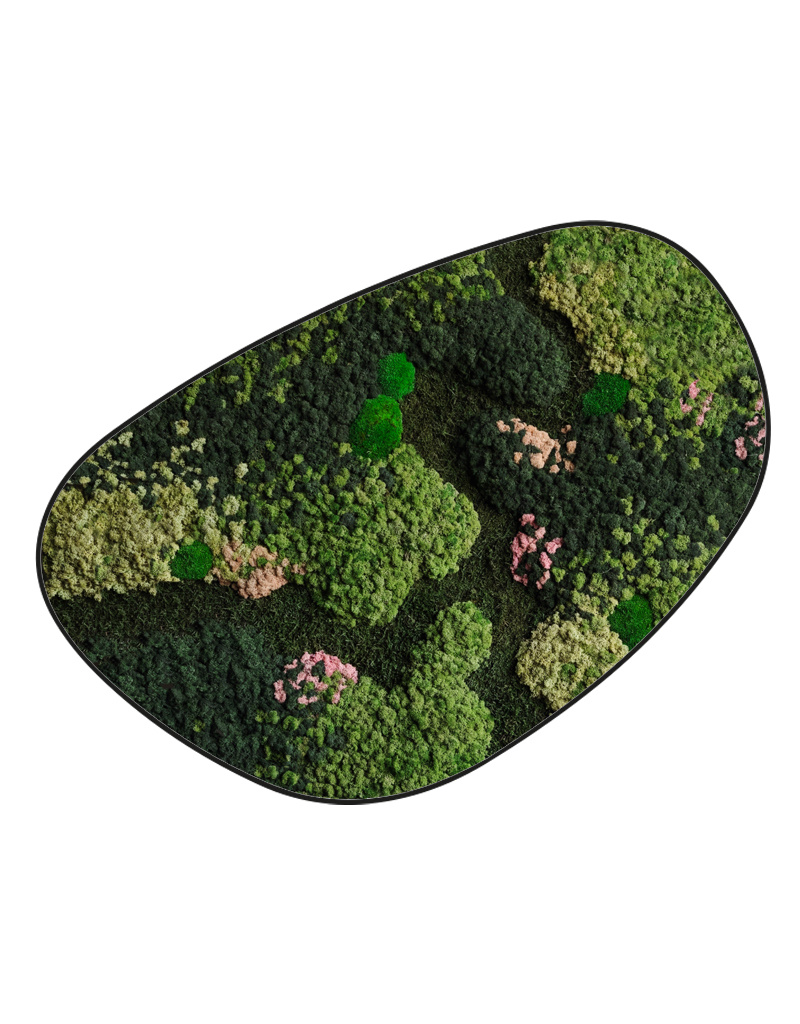 Mos variant FLOW bevat een mossenmix met een natuurlijke rivierachtige structuur. In dit mosschilderij vormt donker platmos een vallei die samenkomt met rendiermos in de kleuren Dimidium, Pine en Vetus. Als accent zijn twee zachte roze tinten verwerkt, rendiermos Rozea en zalmkleur Danae. Bolmos is subtiel geïntegreerd voor extra diepte en structuur. Een sjieke mosstijl met een verfijnde roze touch, een echte blikvanger voor iedere ruimte.