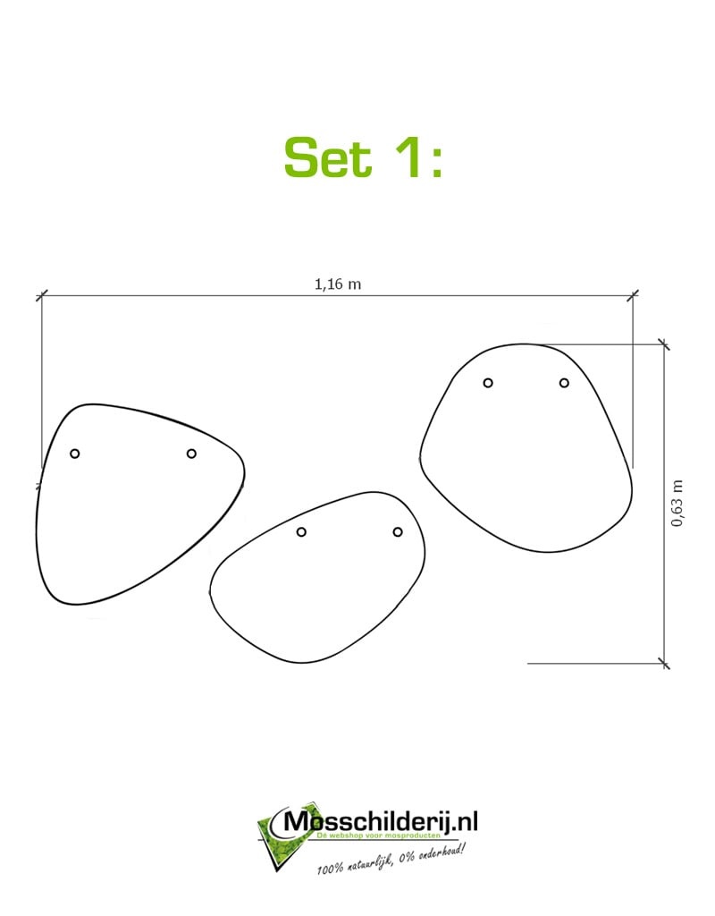 De afmetingen zijn gemeten vanaf het breedste punt. Op de afbeelding is het patroon zichtbaar van een mosdotset in de afmeting 100-100-100 cm (set 4). Aangezien het een natuurproduct is, is ieder mosschilderij uniek. Hierdoor kan de opmaak van het aangeschafte mosschilderij afwijken van de geselecteerde foto. Mocht u een andere maat wensen? Neem contact met ons op via [email protected].