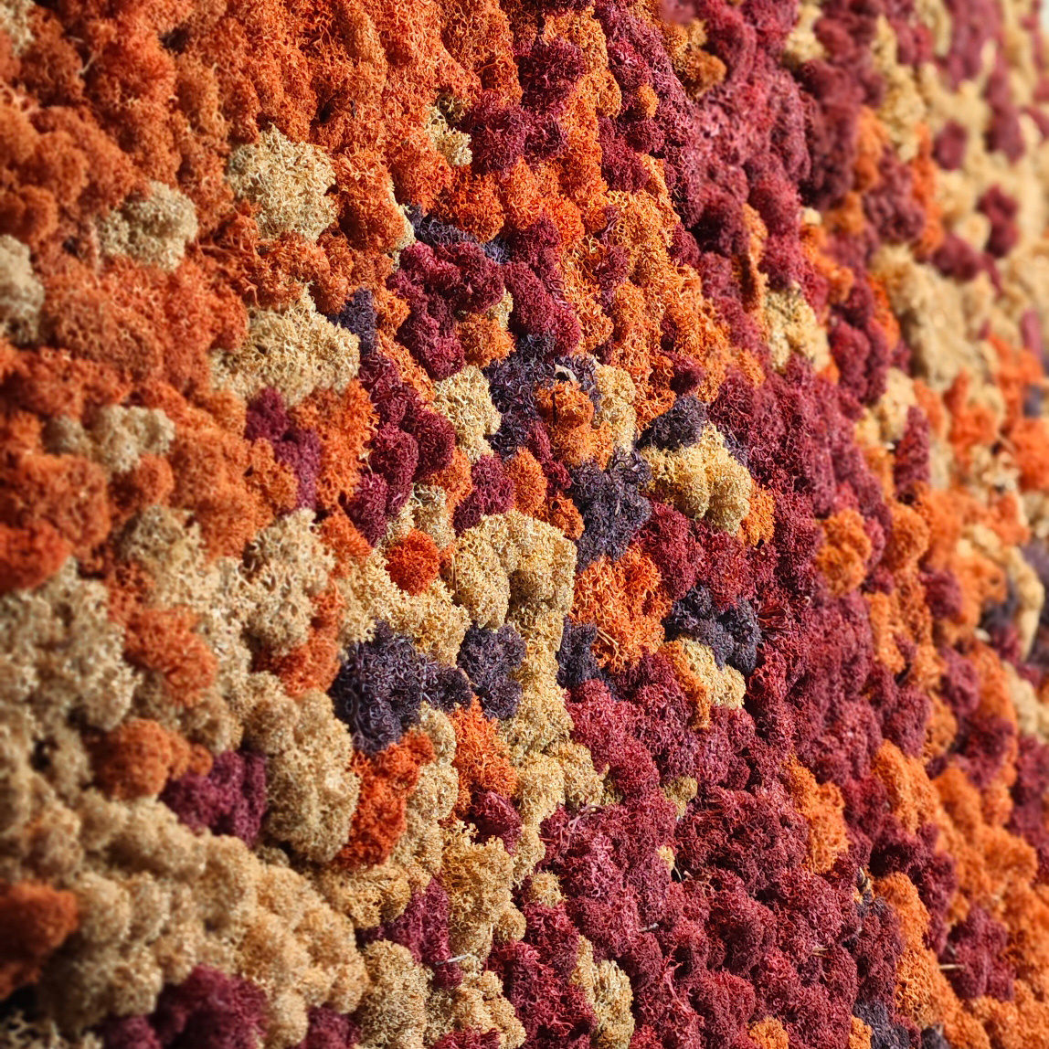 Mosschilderij Autana is een echte eyecatcher die breekt met de traditionele groene moscreaties. In plaats van groen straalt dit kunstwerk warmte en diepte uit, dankzij een unieke mix van kleuren: het vurige Persici, de lichte tinten van Naturalis, het zachte Casia en het diepe Bordeaux. Samen creëren ze een expressief en levendig geheel dat elke ruimte een krachtige en stijlvolle uitstraling geeft.