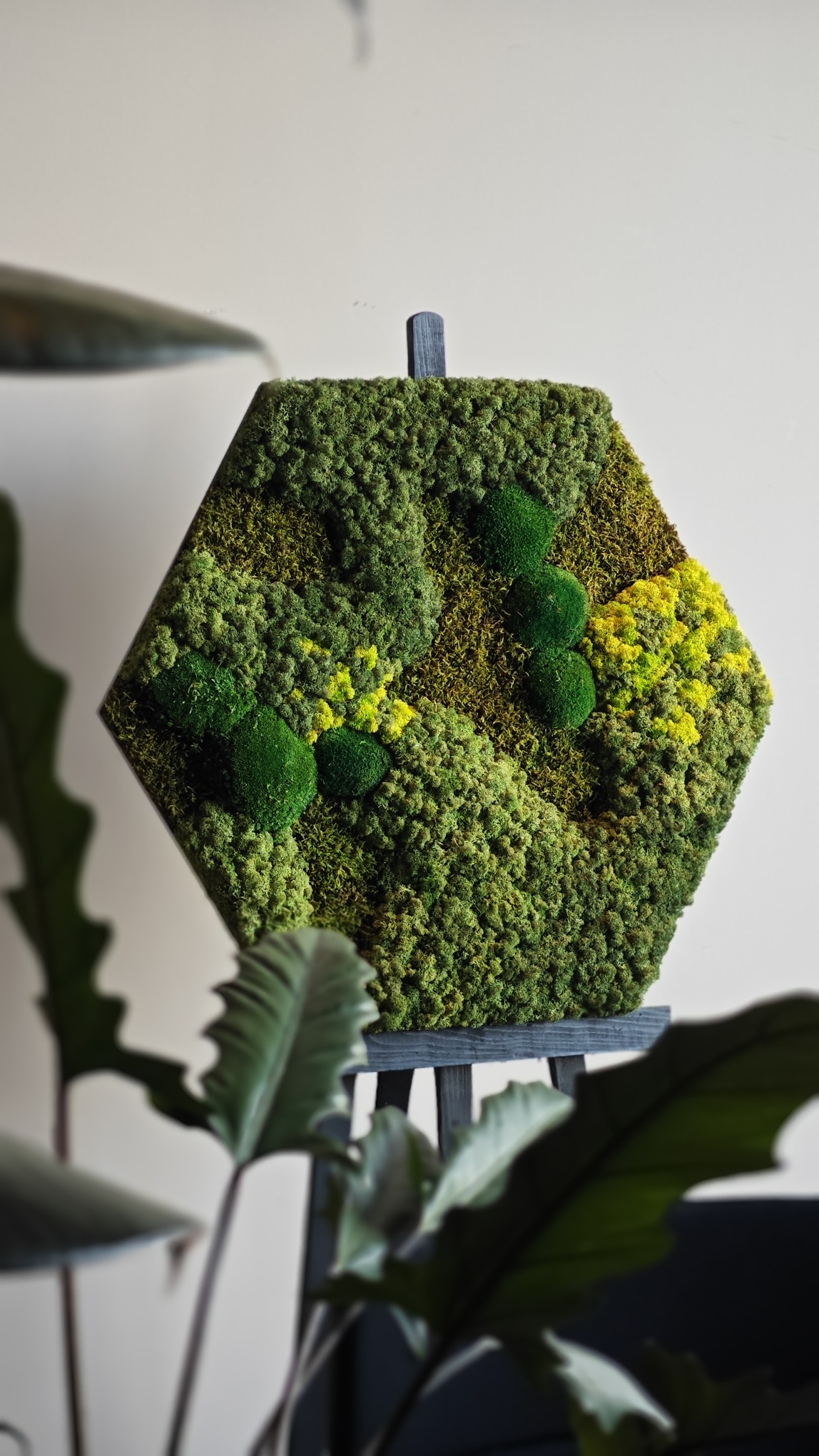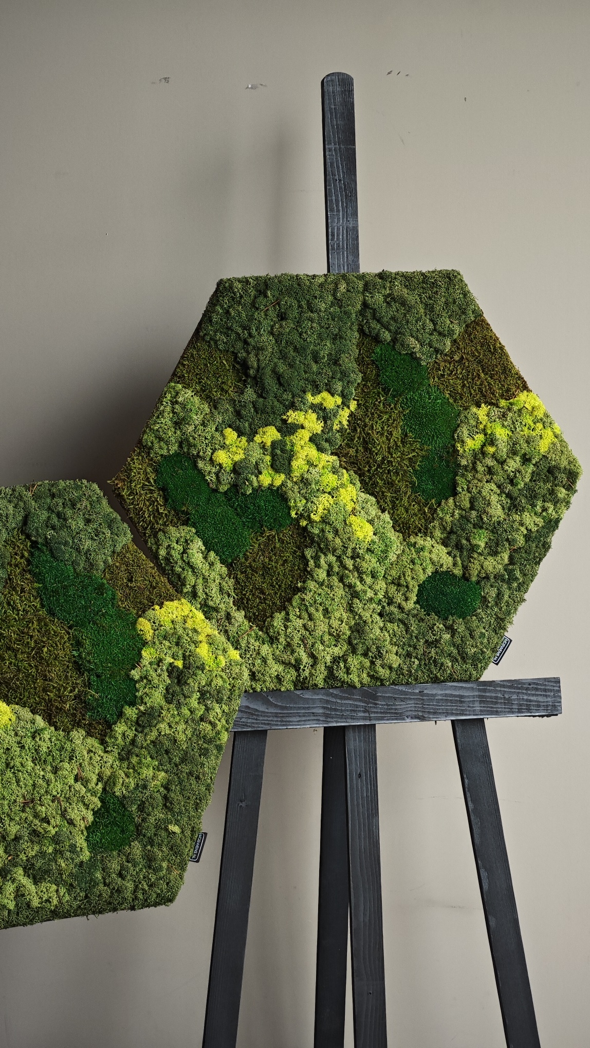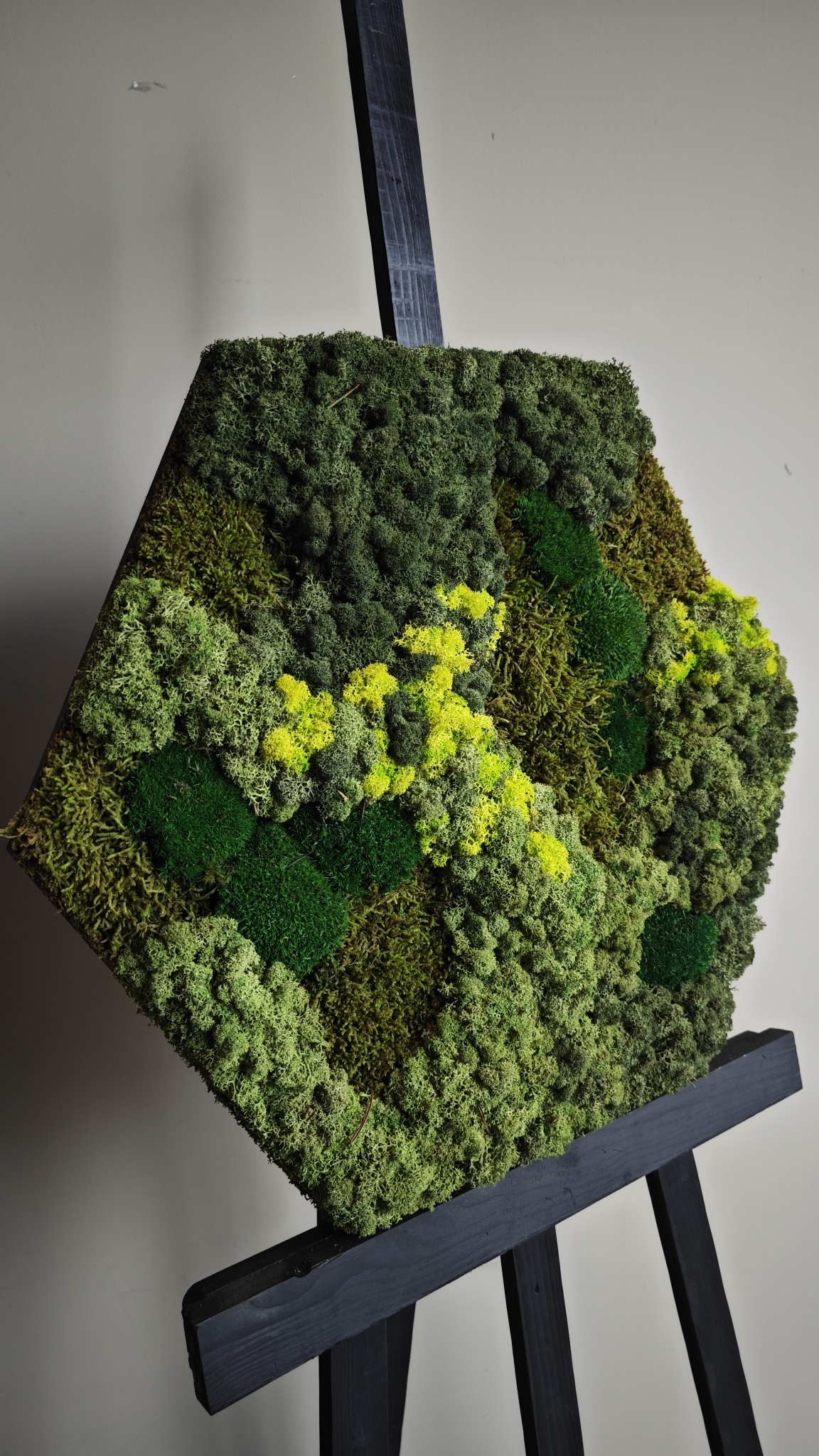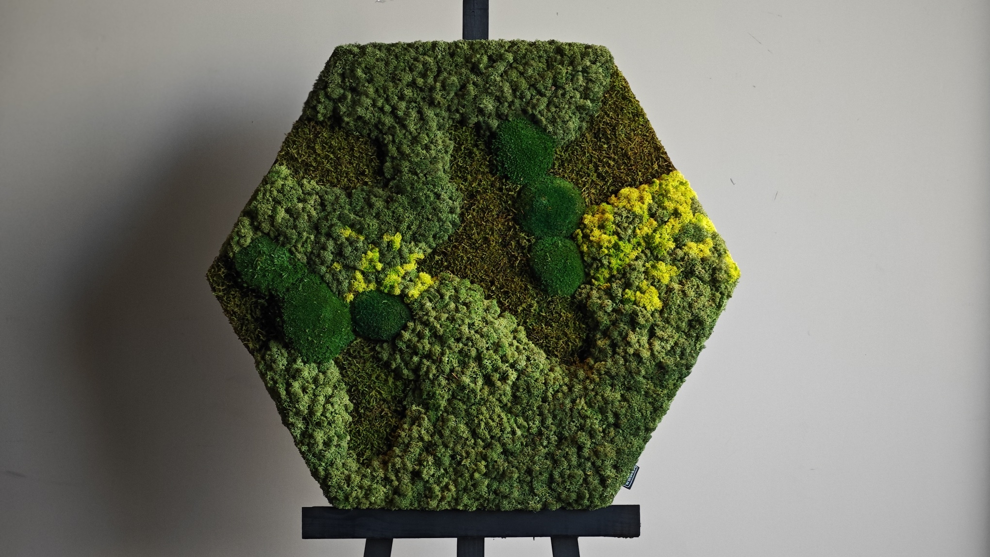 Op de afbeelding is het patroon zichtbaar van een hexagon in de afmeting 100 cm. Aangezien het een natuurproduct is, is ieder mosschilderij uniek. Hierdoor kan de opmaak van het aangeschafte mosschilderij afwijken van de geselecteerde foto. Mocht u een andere maat wensen? Neem contact met ons op via [email protected]