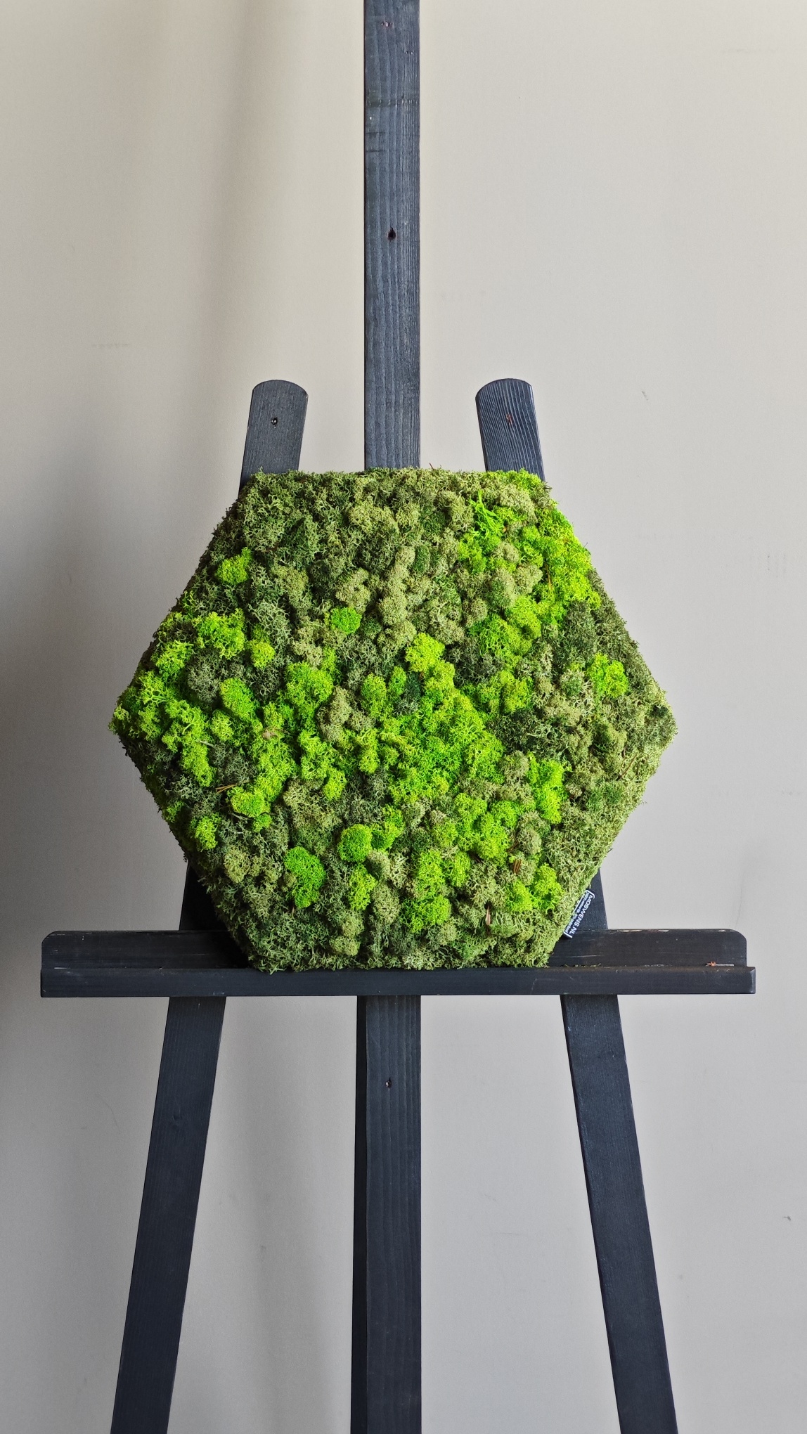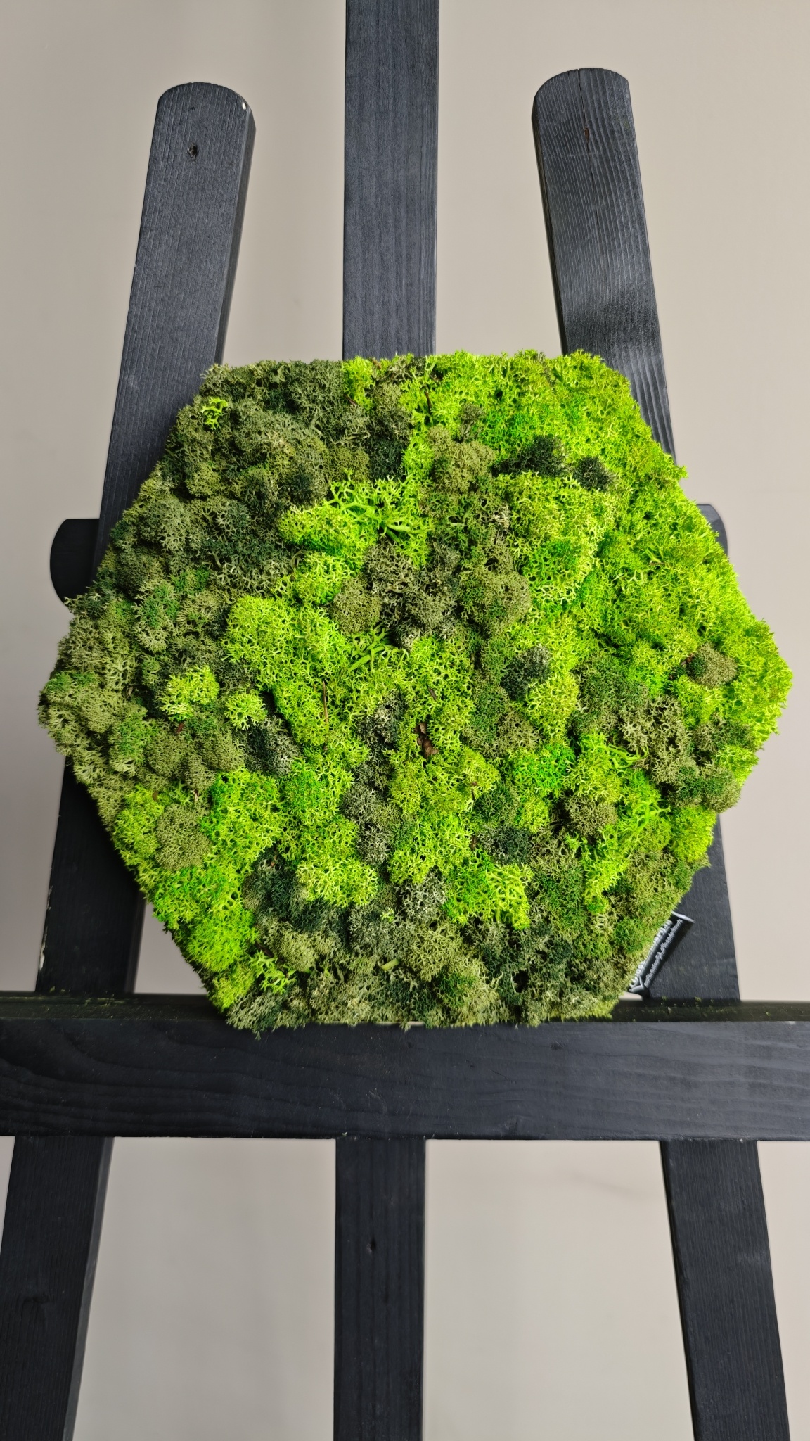Op de afbeelding is het patroon zichtbaar van een hexagon in de afmeting 100 cm. Aangezien het een natuurproduct is, is ieder mosschilderij uniek. Hierdoor kan de opmaak van het aangeschafte mosschilderij afwijken van de geselecteerde foto. Mocht u een andere maat wensen? Neem contact met ons op via [email protected]