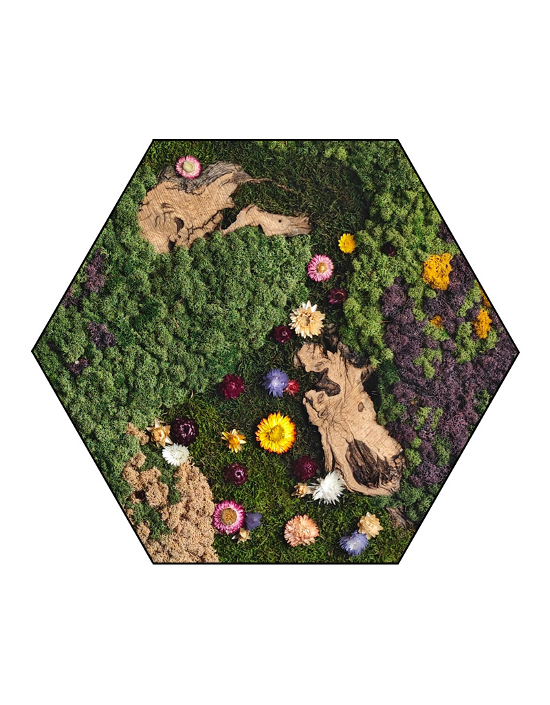 Op de afbeelding is het patroon zichtbaar van een hexagon in de afmeting 100 cm. Aangezien het een natuurproduct is, is ieder mosschilderij uniek. Hierdoor kan de opmaak van het aangeschafte mosschilderij afwijken van de geselecteerde foto. Mocht u een andere maat wensen? Neem contact met ons op via [email protected]