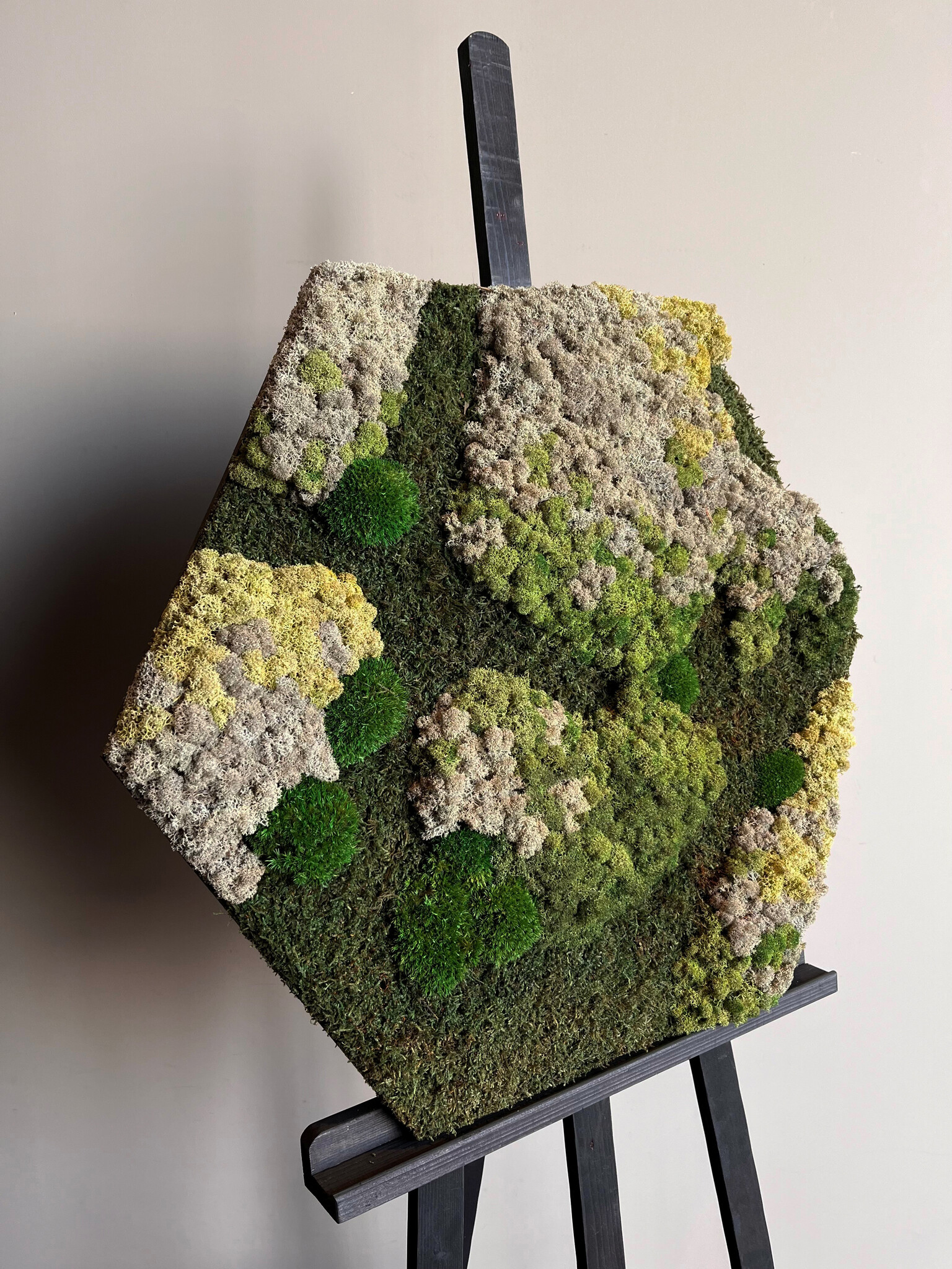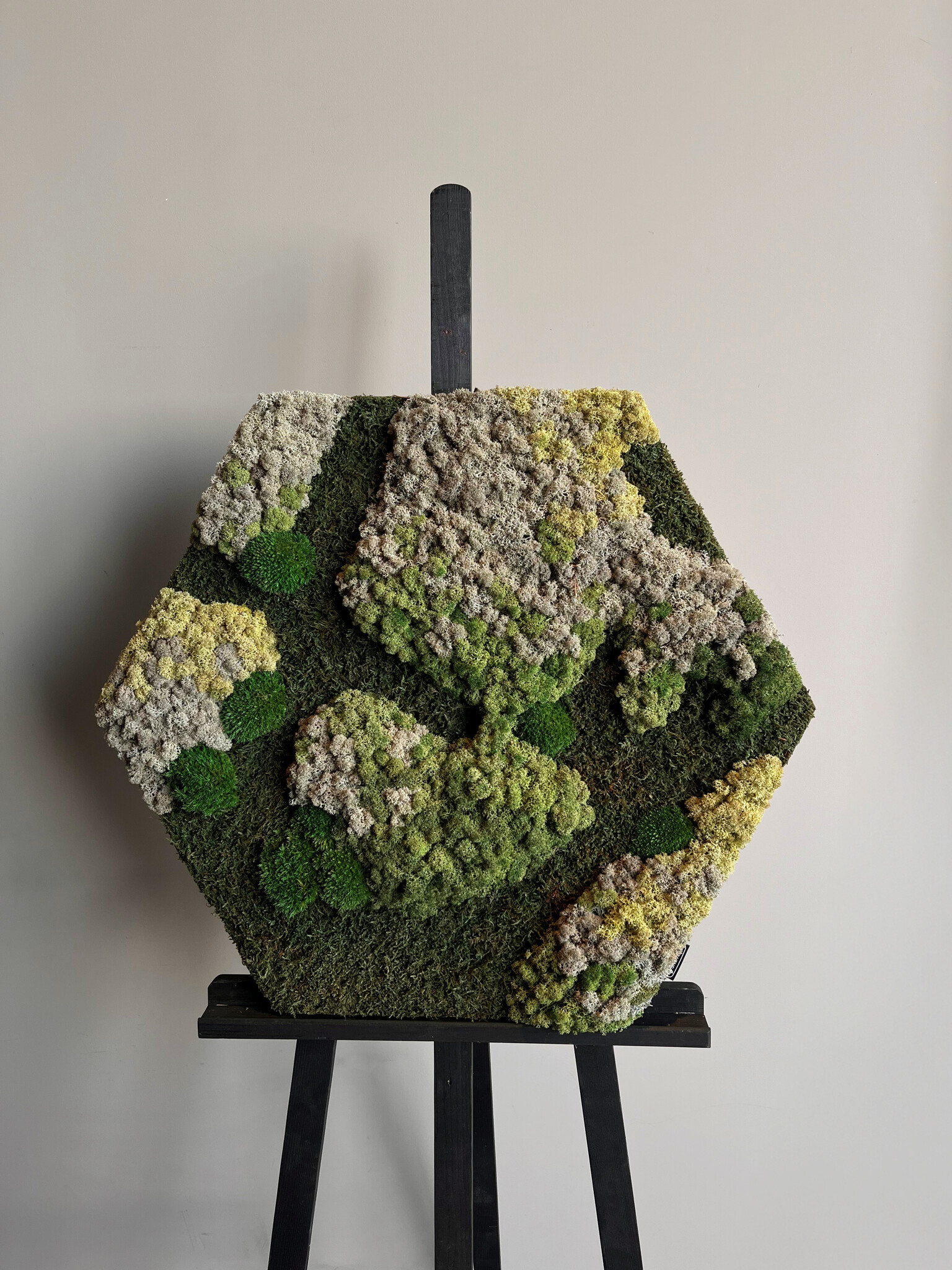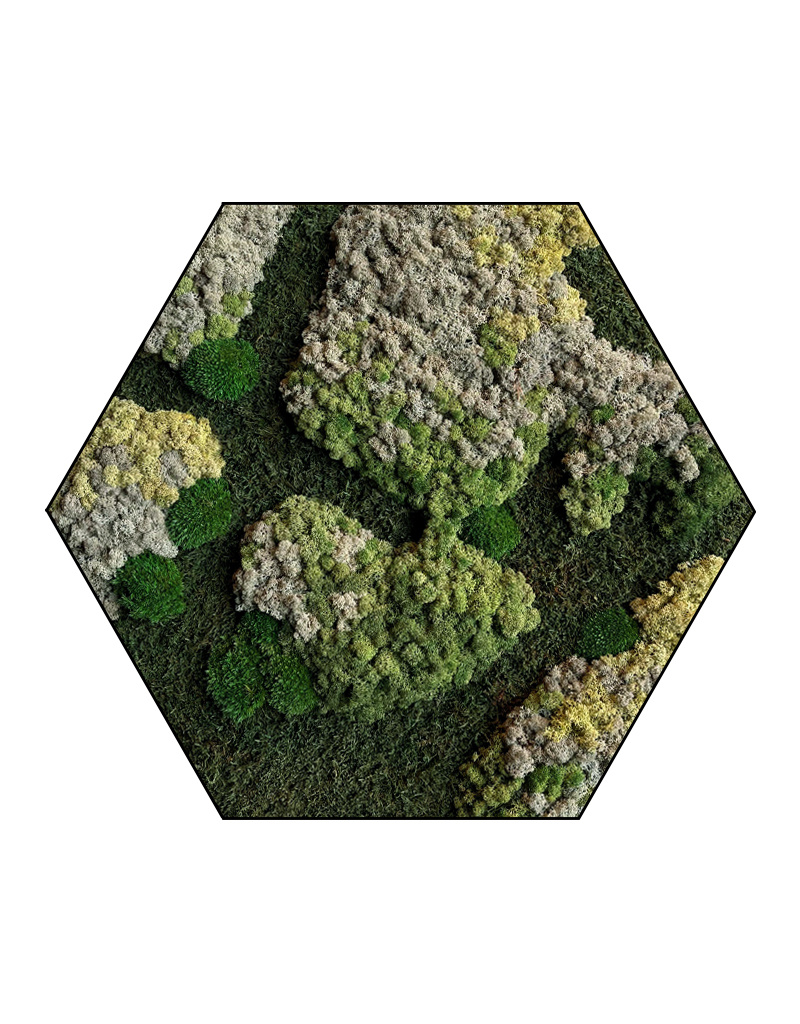 Op de afbeelding is het patroon zichtbaar van een hexagon in de afmeting 100 cm. Aangezien het een natuurproduct is, is ieder mosschilderij uniek. Hierdoor kan de opmaak van het aangeschafte mosschilderij afwijken van de geselecteerde foto. Mocht u een andere maat wensen? Neem contact met ons op via [email protected]