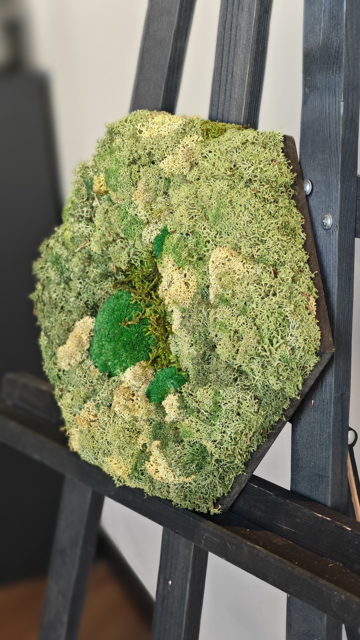 Op de afbeelding is het patroon zichtbaar van een hexagon in de afmeting 100 cm. Aangezien het een natuurproduct is, is ieder mosschilderij uniek. Hierdoor kan de opmaak van het aangeschafte mosschilderij afwijken van de geselecteerde foto. Mocht u een andere maat wensen? Neem contact met ons op via [email protected]