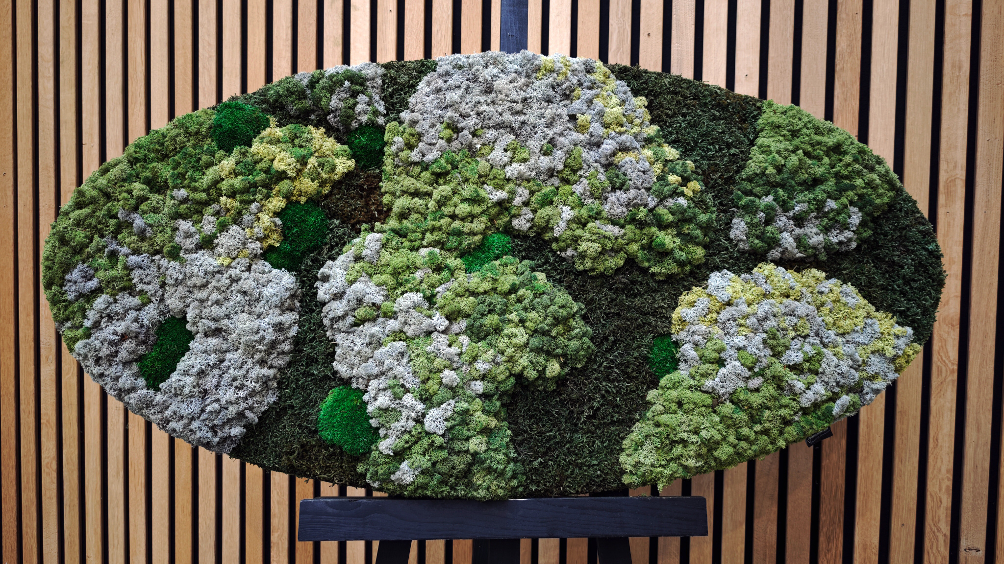 Afwerking 2: Rand afgewerkt met een opstaande stalen rand. De stalen rand is voorzien van een hoogwaardige poedercoating in de kleur MAT zwart RAL 9005 (industrieel zwart). De zwarte stalen randen van de ovalen zijn verkrijgbaar in twee maten: 120x60 cm en 160x80 cm. Hierdoor krijgt het mosschilderij een gewicht van +/- 14 KG per m².