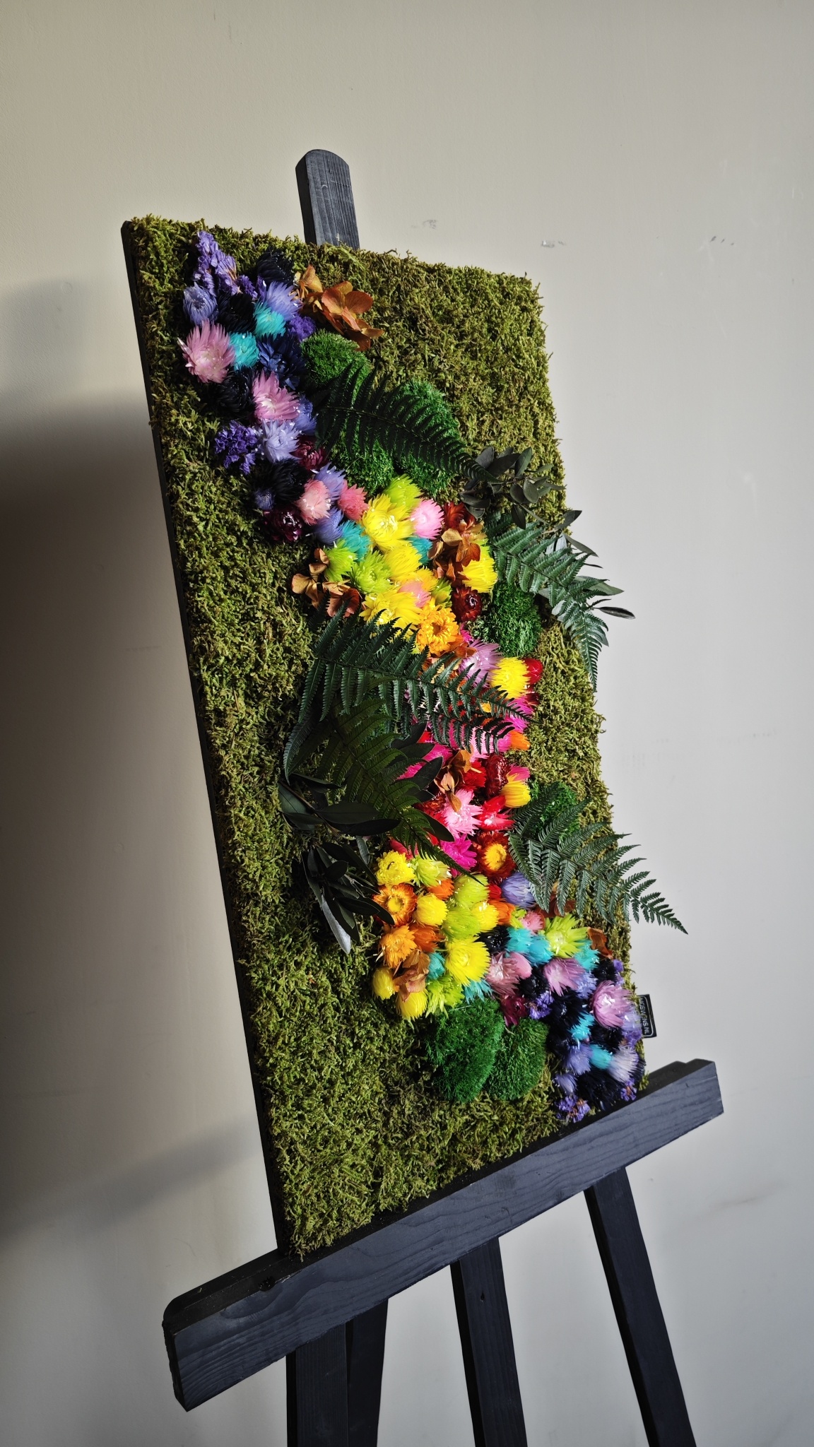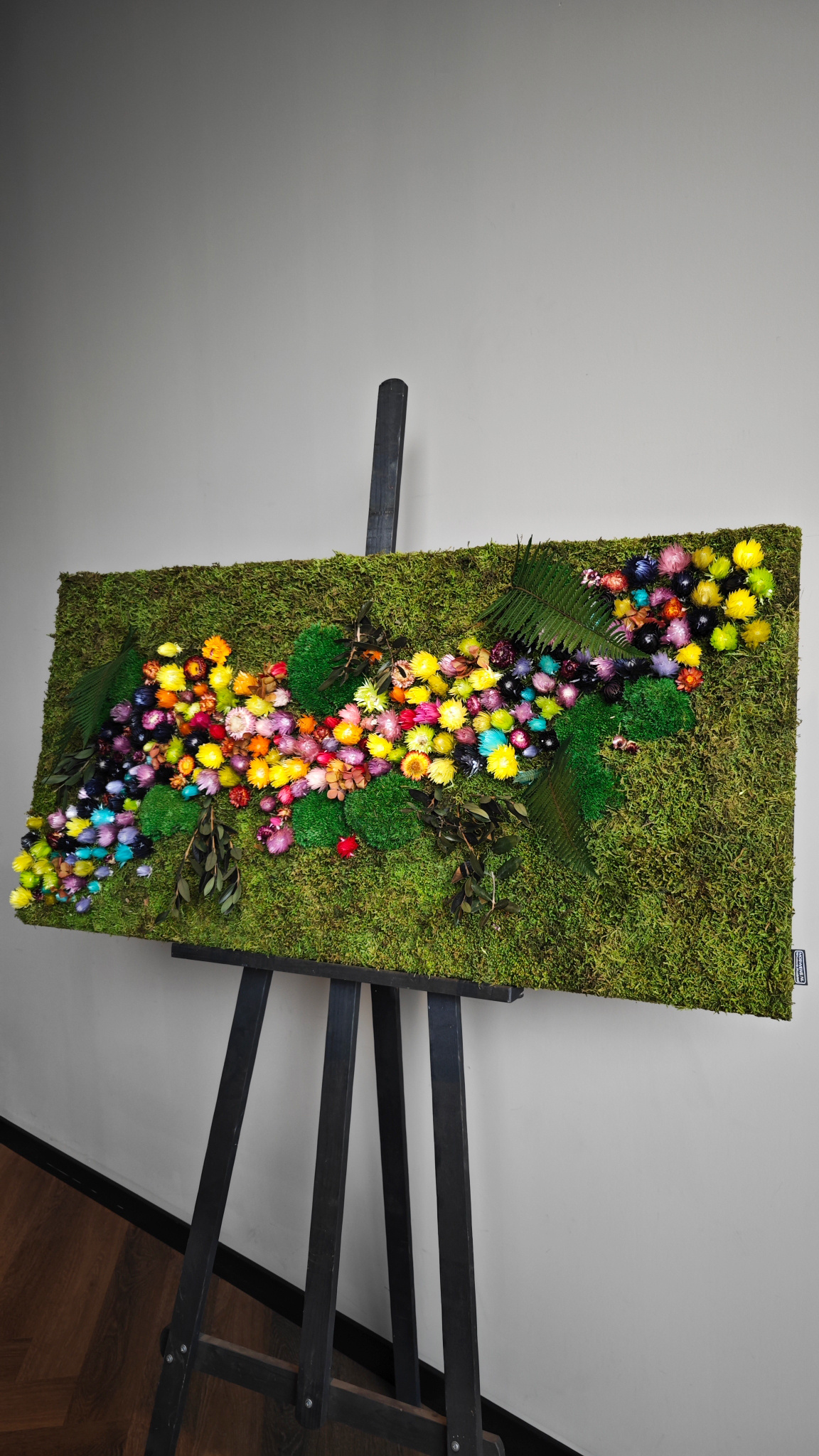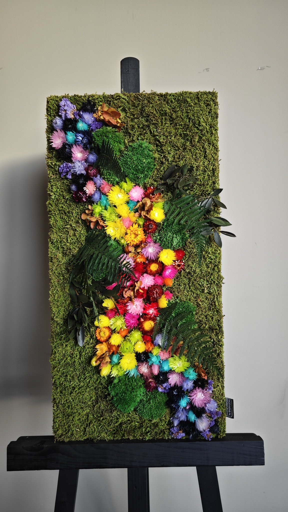 Mosschilderij Liva is een mosschilderij dat is samengesteld uit een basis van platmos en bolmos, aangevuld met jungle bladeren. Daarnaast bevat dit mosschilderij een sierlijke lijn van droogbloemen in levendige regenboogkleuren, die het geheel een speelse en sierlijke uitstraling geven. Dit mosschilderij combineert de natuurlijke rust van het mos met de kleurrijke vrolijkheid van bloemen en is bovendien volledig onderhoudsvrij.