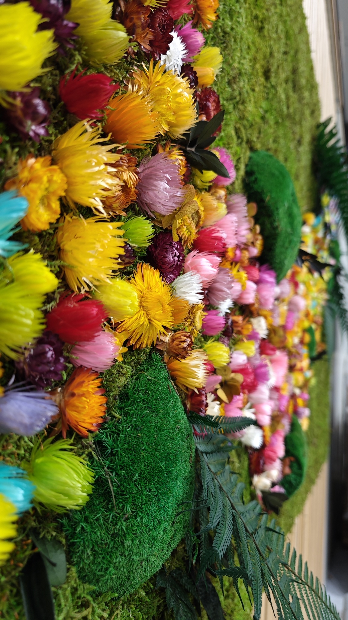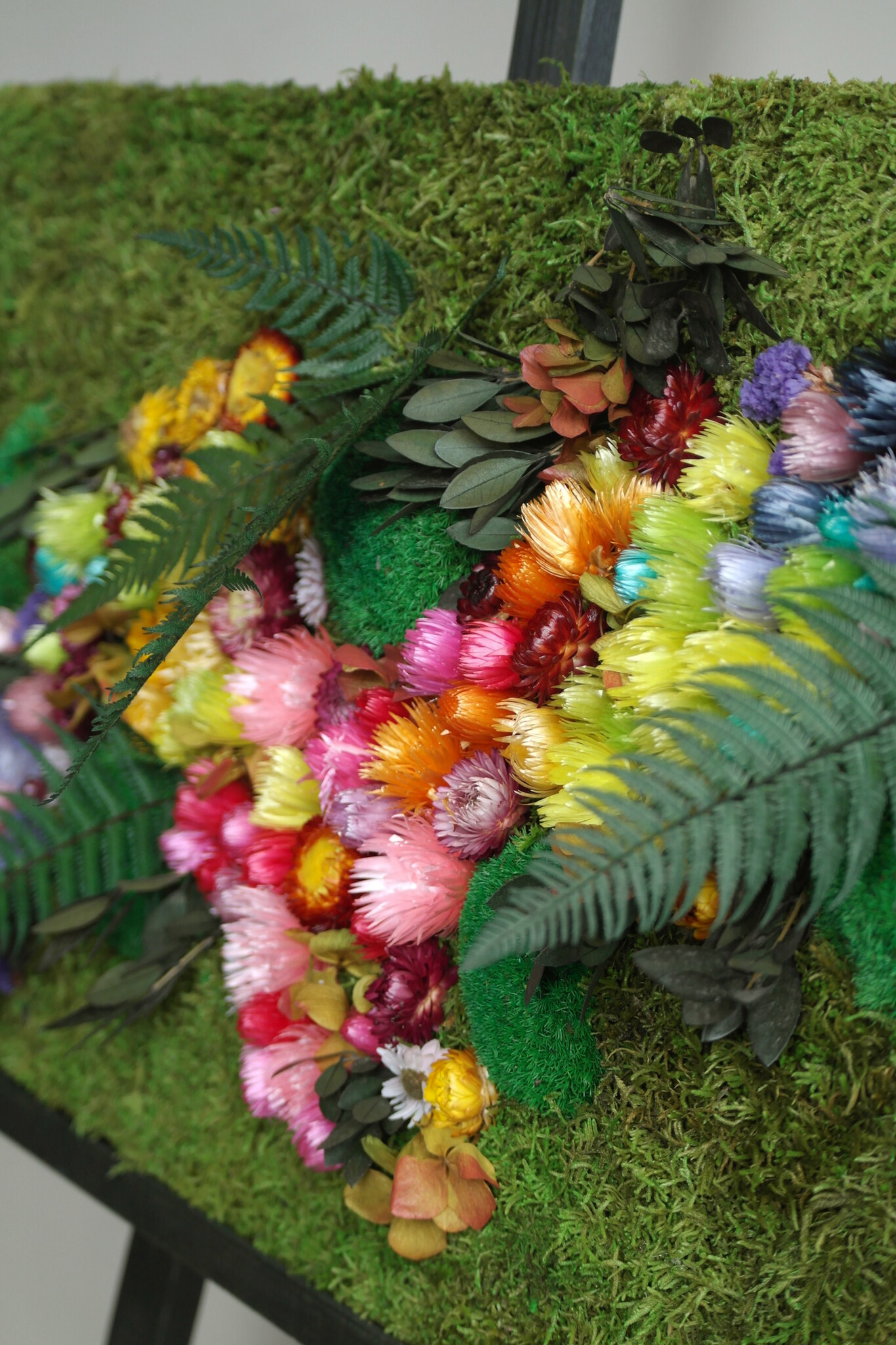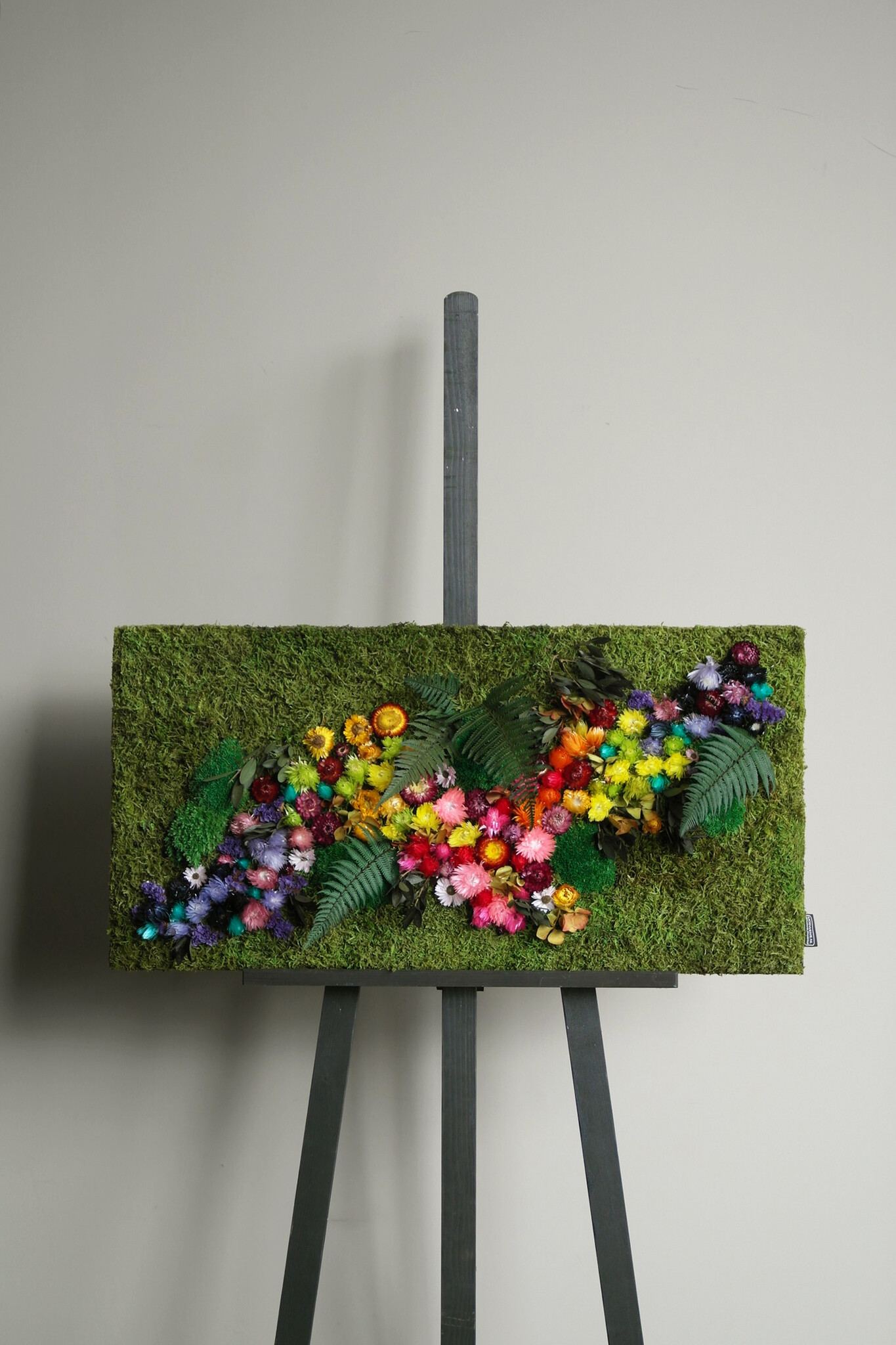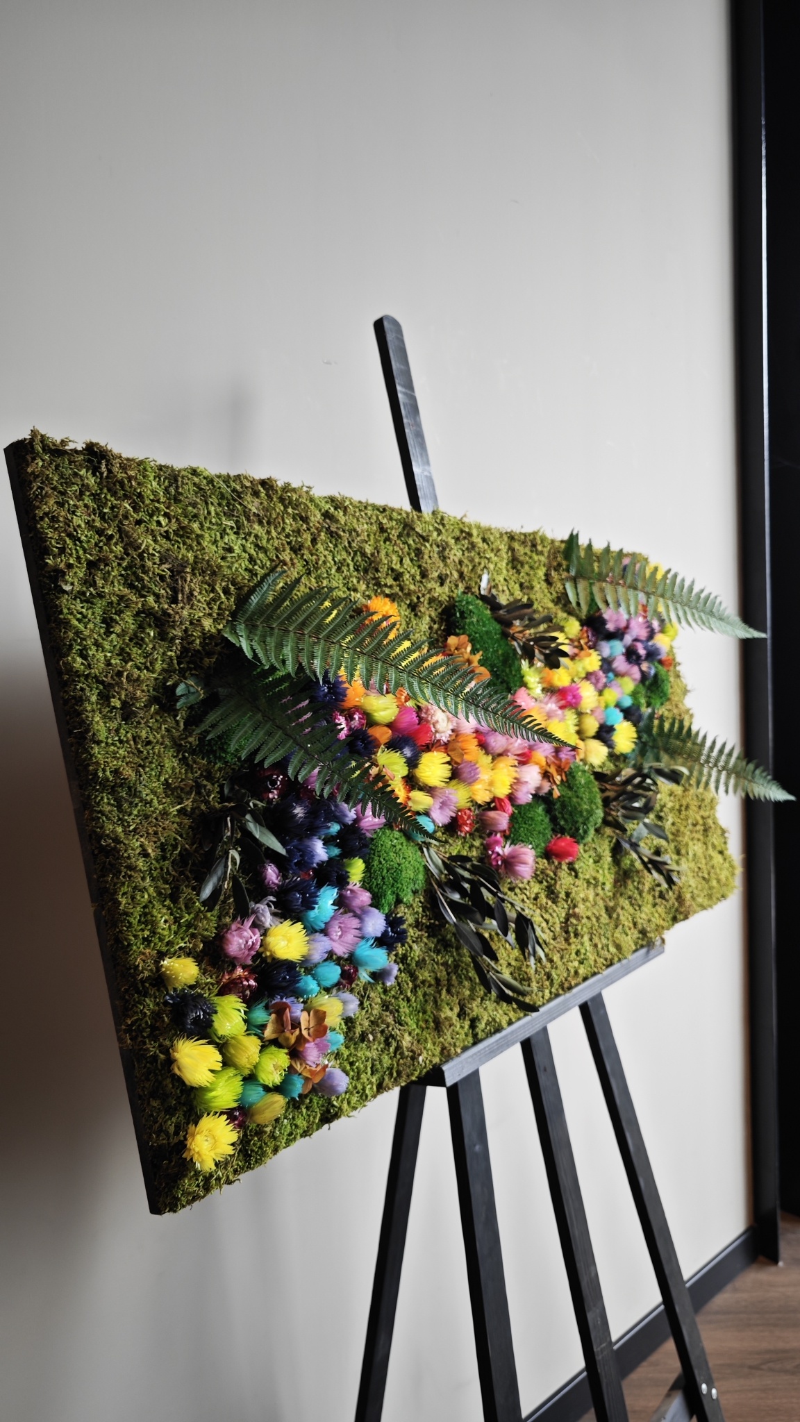 Mosschilderij Liva is een mosschilderij dat is samengesteld uit een basis van platmos en bolmos, aangevuld met jungle bladeren. Daarnaast bevat dit mosschilderij een sierlijke lijn van droogbloemen in levendige regenboogkleuren, die het geheel een speelse en sierlijke uitstraling geven. Dit mosschilderij combineert de natuurlijke rust van het mos met de kleurrijke vrolijkheid van bloemen en is bovendien volledig onderhoudsvrij.