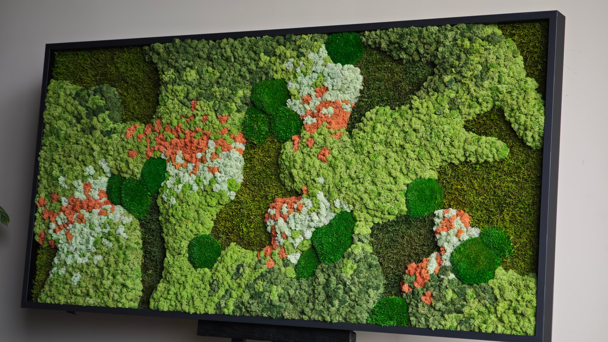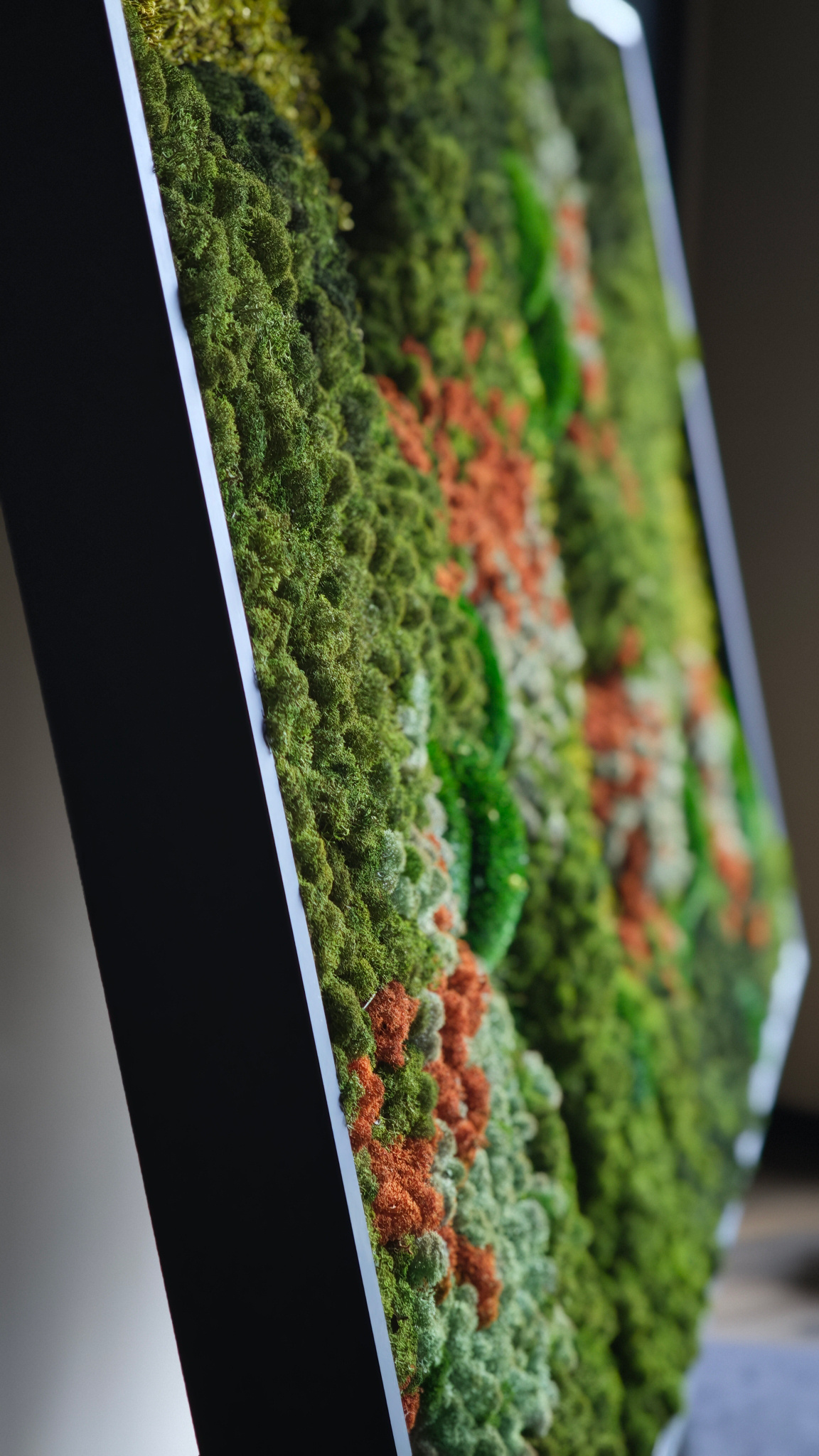 De kopse zijde van het mosschilderij is zwart. De rand van het mos werken we netjes afgerond af, tot aan het zwarte paneel.
