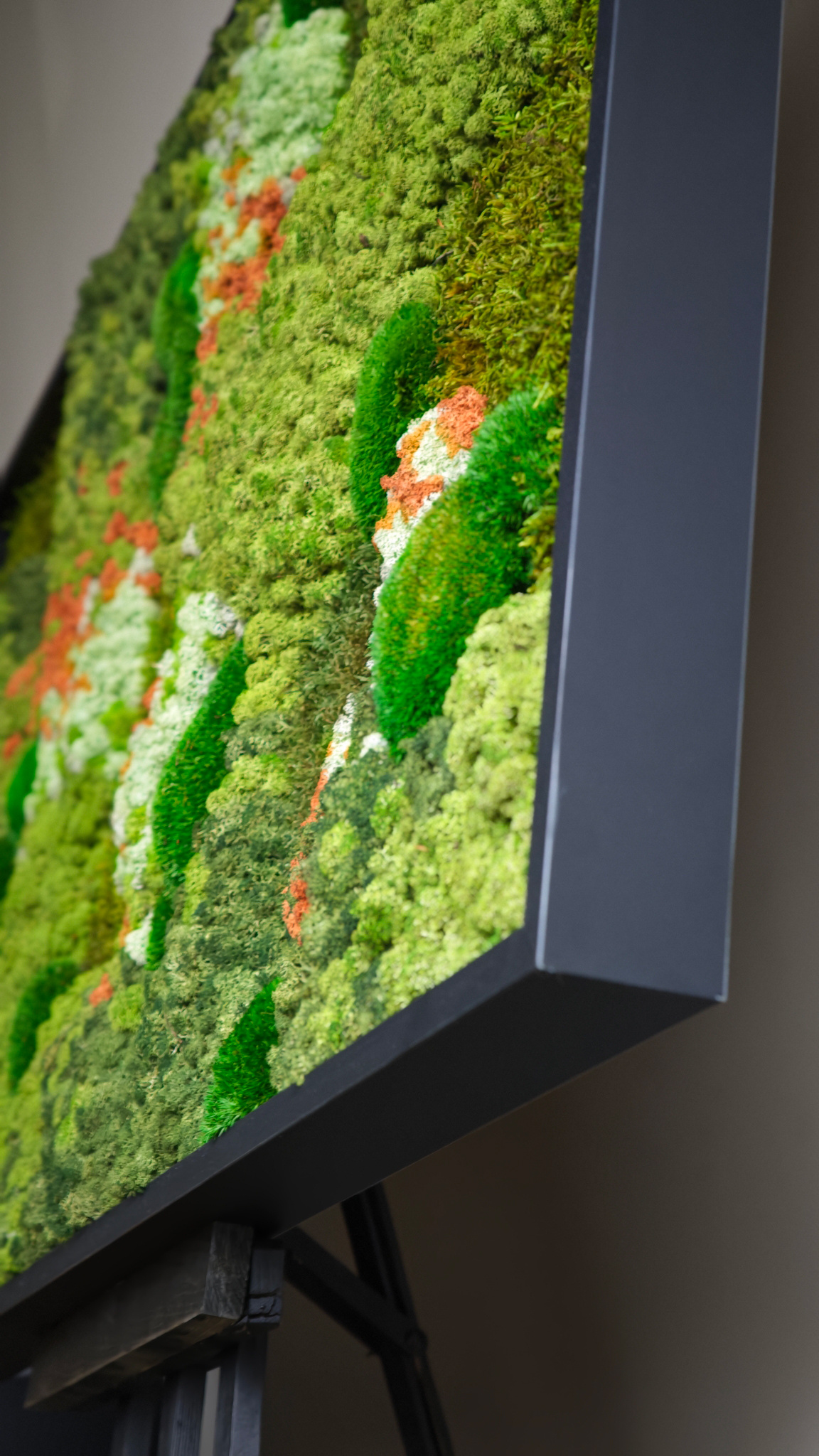 Onze mosschilderijen zorgen voor een unieke groene sfeer, wat uitermate geschikt is om toe te passen in (leef)keukens/ontvangstruimtes/kantoorruimtes/verblijfsruimtes of boven de bank bij u thuis.