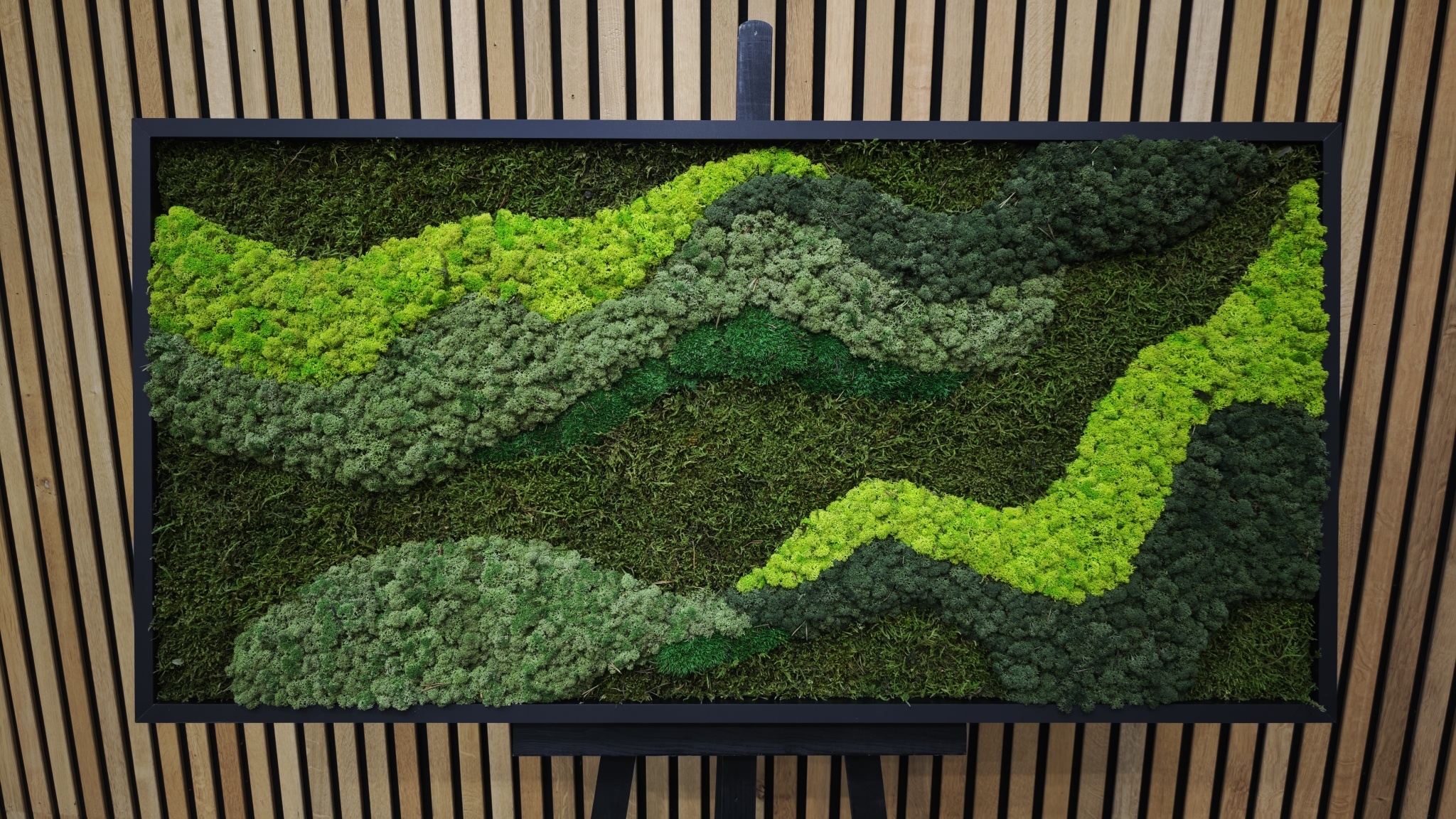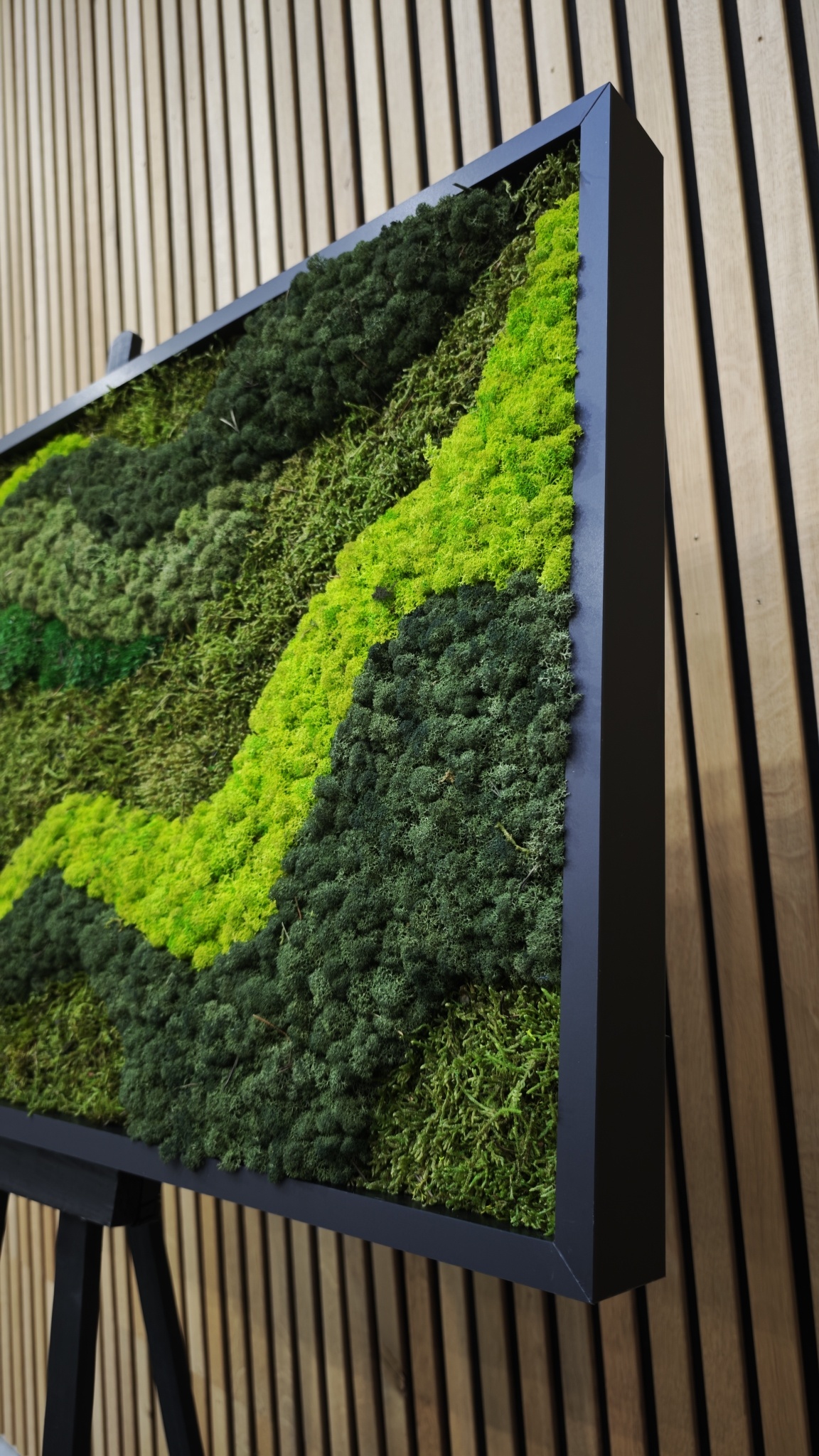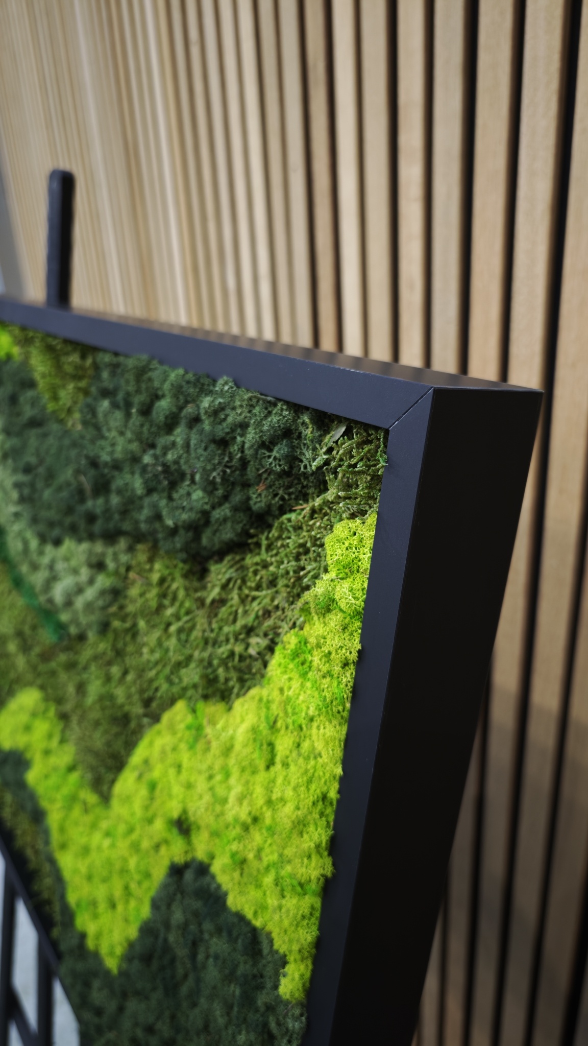 De kopse zijde van het mosschilderij is zwart. De rand van het mos werken we netjes afgerond af, tot aan het zwarte paneel.