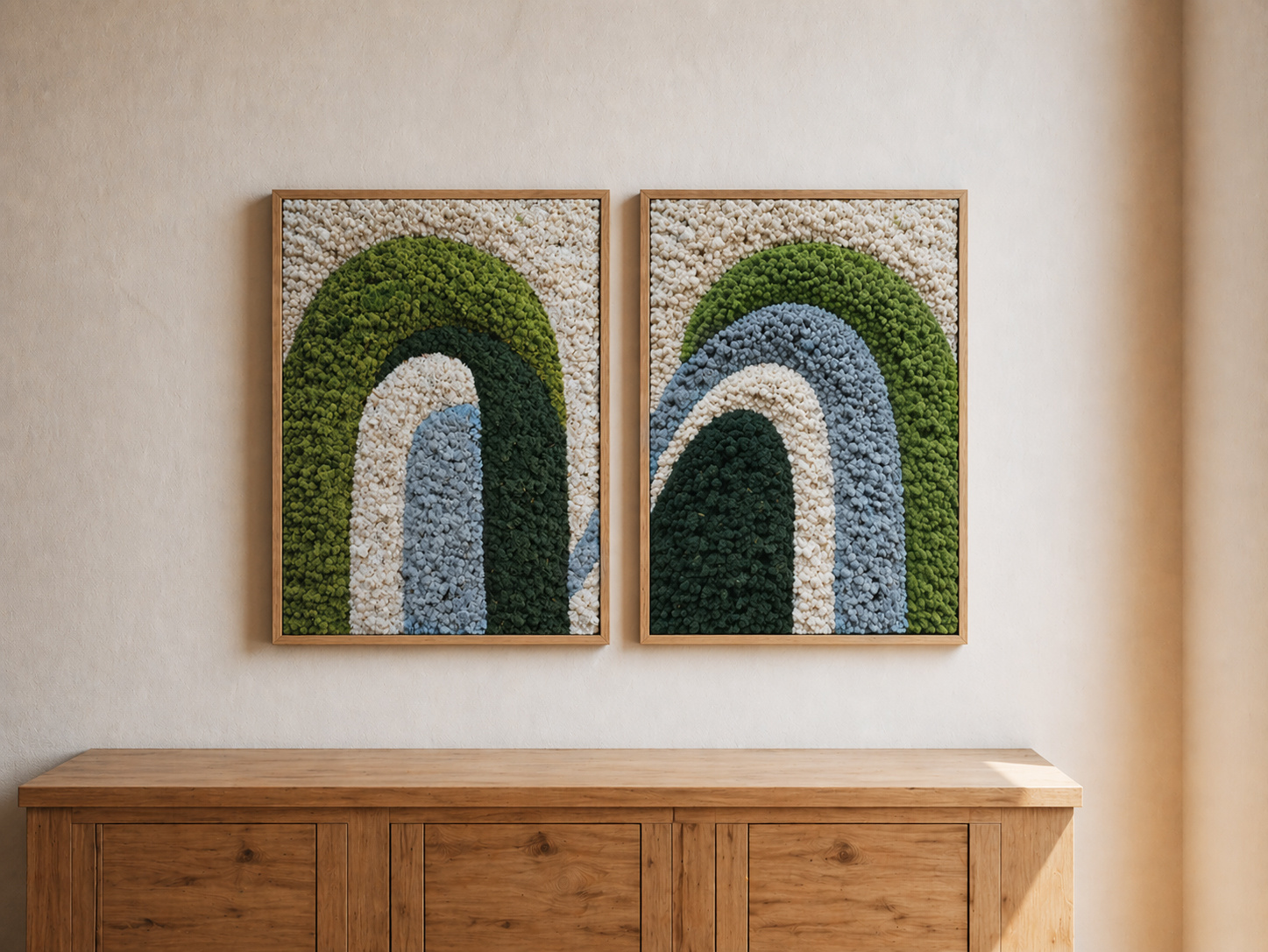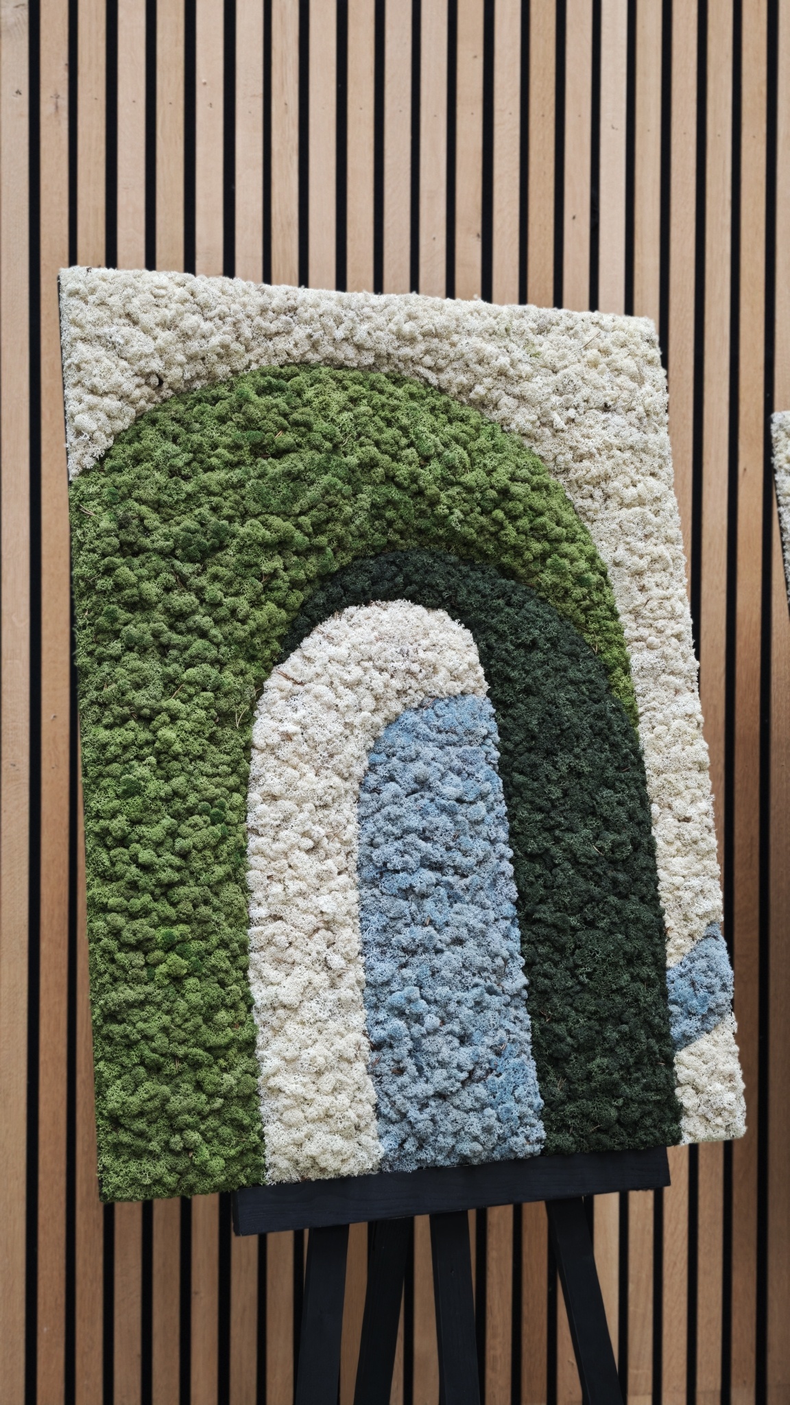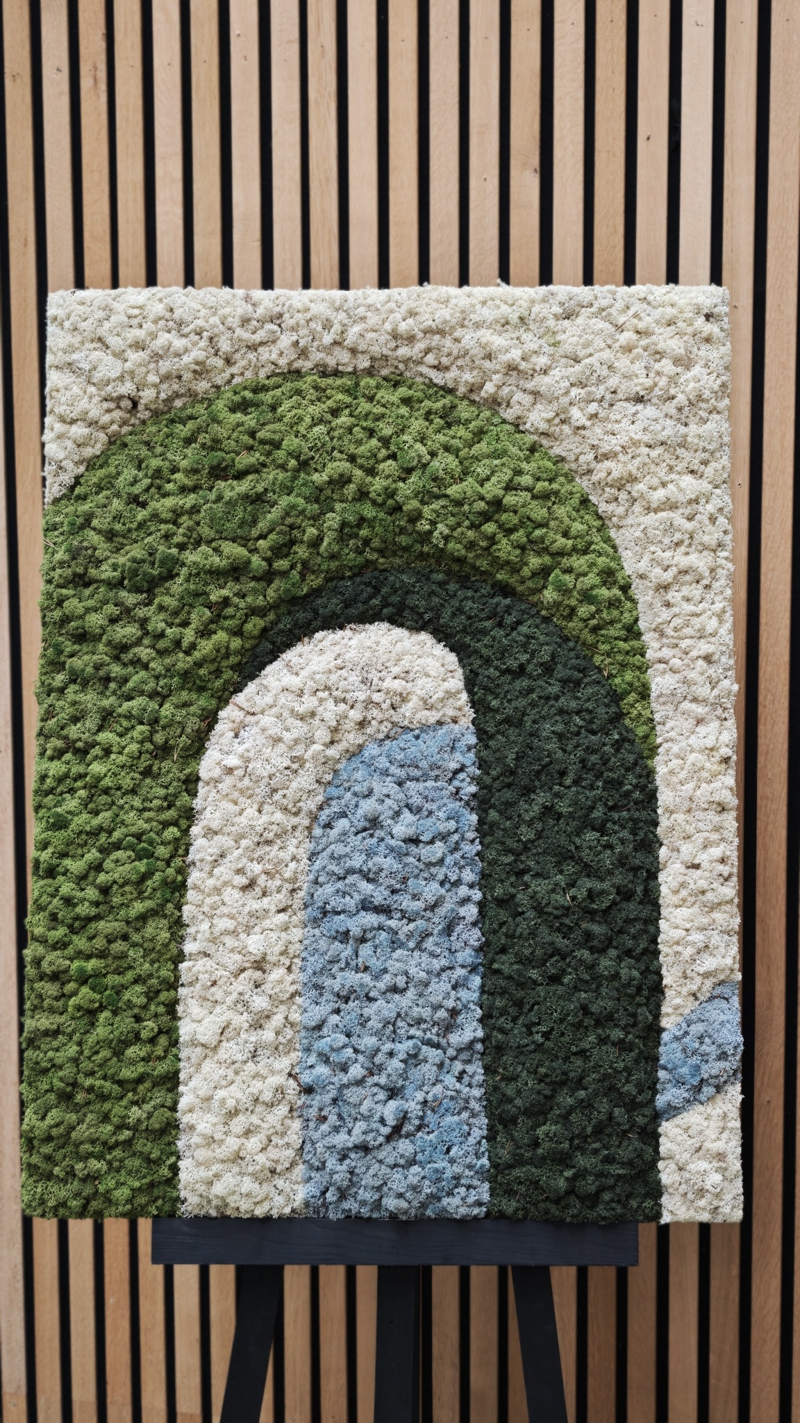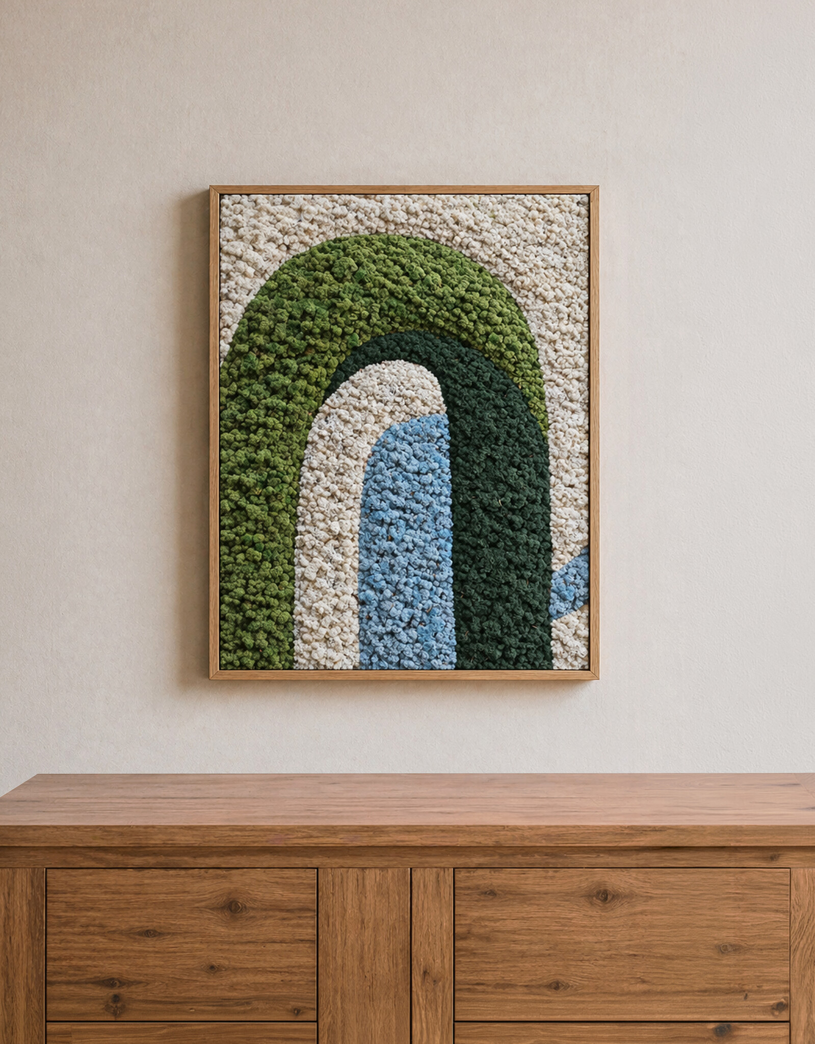 Ervaar de kracht van Japandi design, gemaakt van echt mos in een rustgevende compositie. Elk mosschilderij wordt met de hand gemaakt, is volledig onderhoudsvrij en direct klaar om stijlvol op te hangen. De strakke lijnen worden afgerond naar een andere moskleur, waardoor er een prachtig 3D-effect ontstaat dat diepte en karakter aan je interieur geeft.