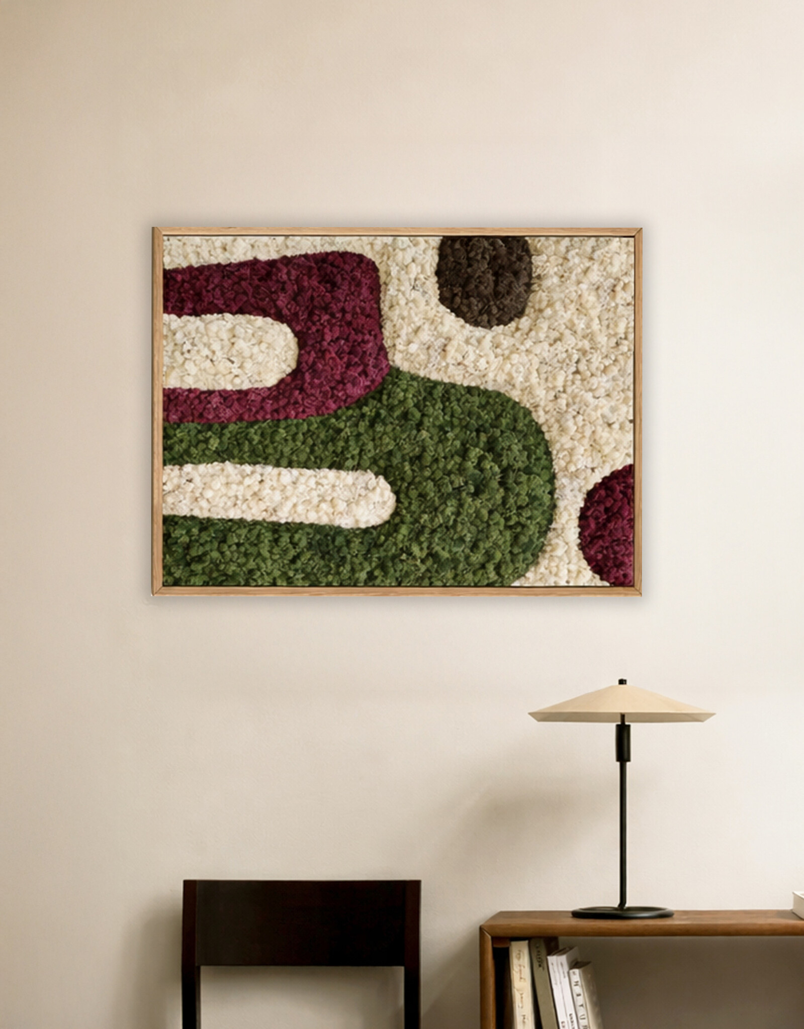 Ervaar de kracht van Japandi design, gemaakt van echt mos in een rustgevende compositie. Elk mosschilderij wordt met de hand gemaakt, is volledig onderhoudsvrij en direct klaar om stijlvol op te hangen. De strakke lijnen worden afgerond naar een andere moskleur, waardoor er een prachtig 3D-effect ontstaat dat diepte en karakter aan je interieur geeft.