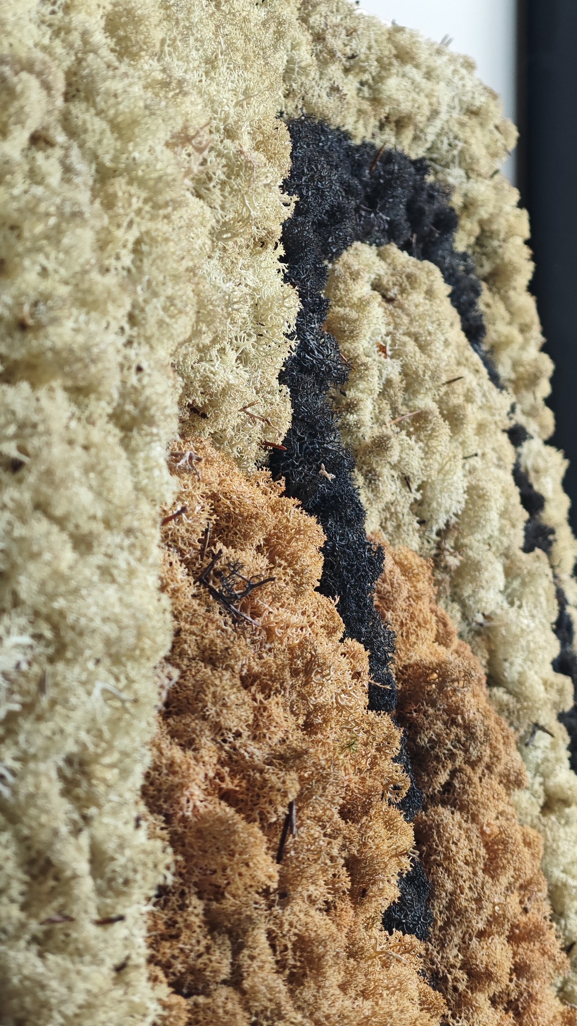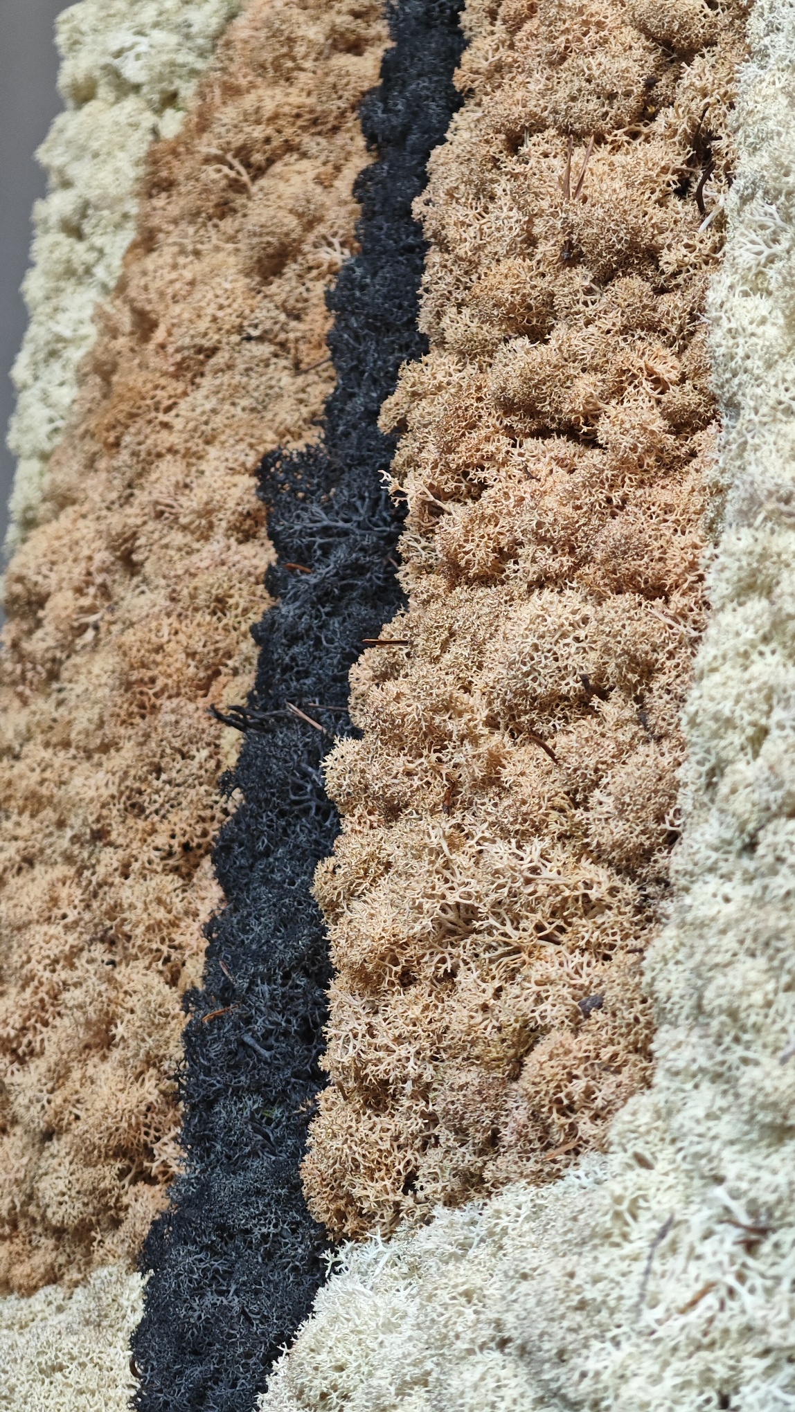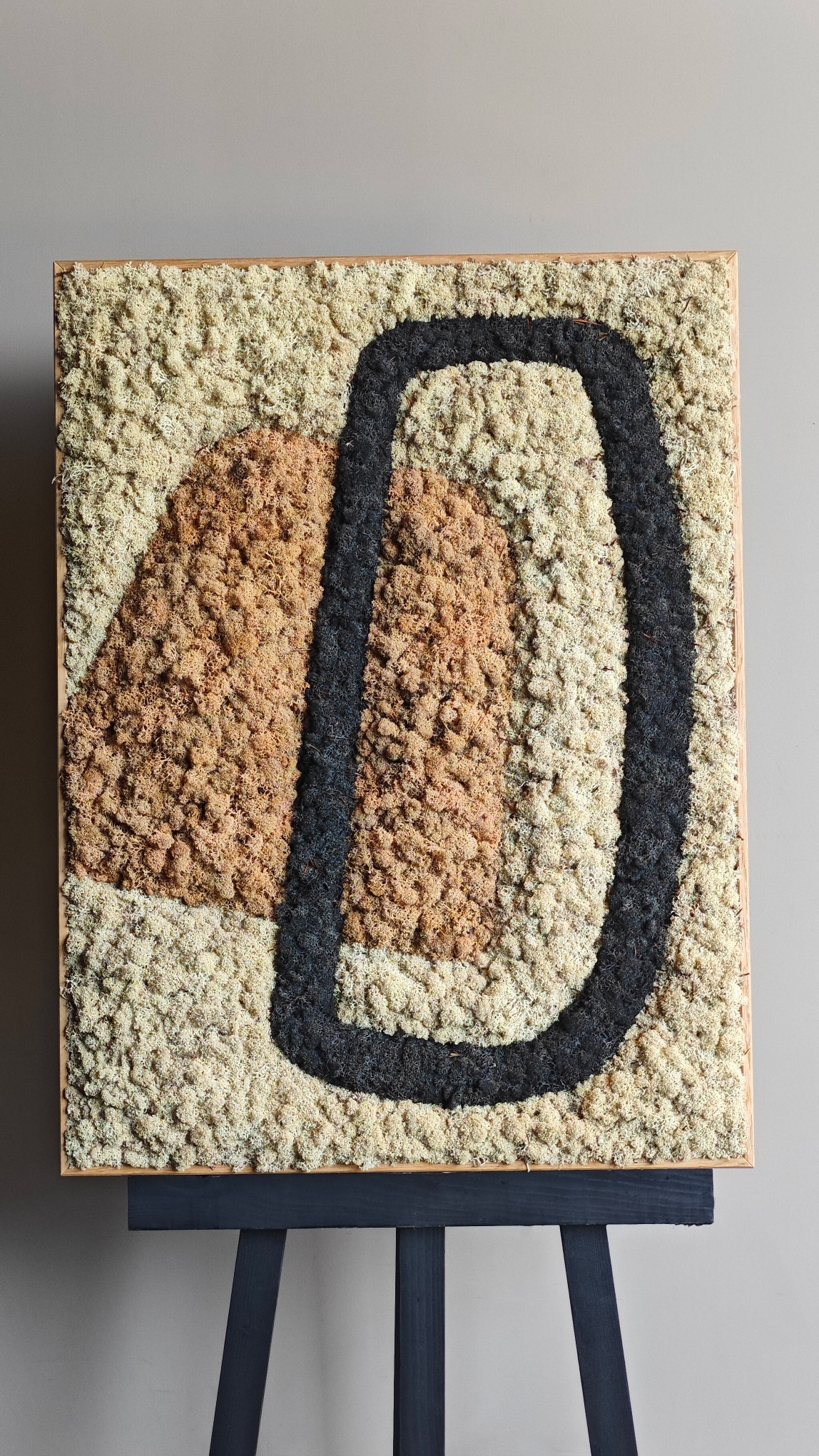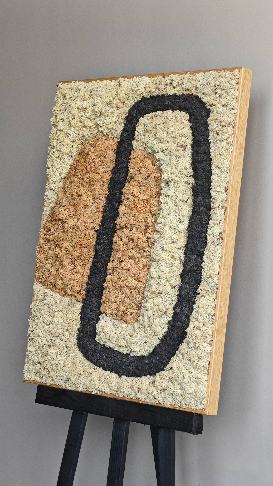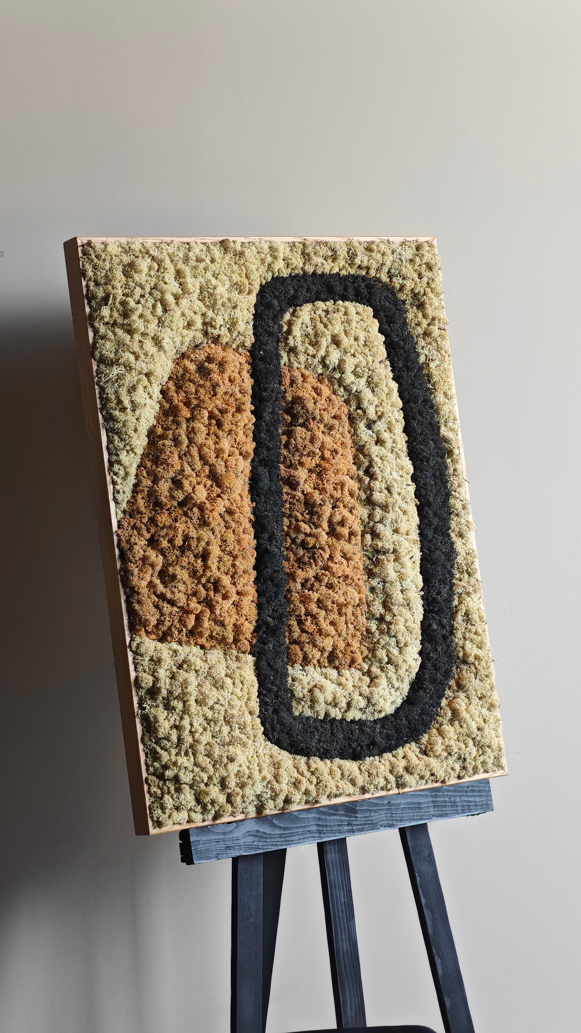 De kopse zijde van het mosschilderij is zwart. De rand van het mos wordt netjes afgerond tot aan het zwarte paneel.