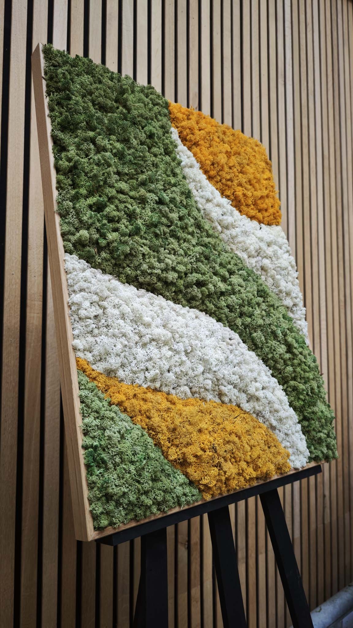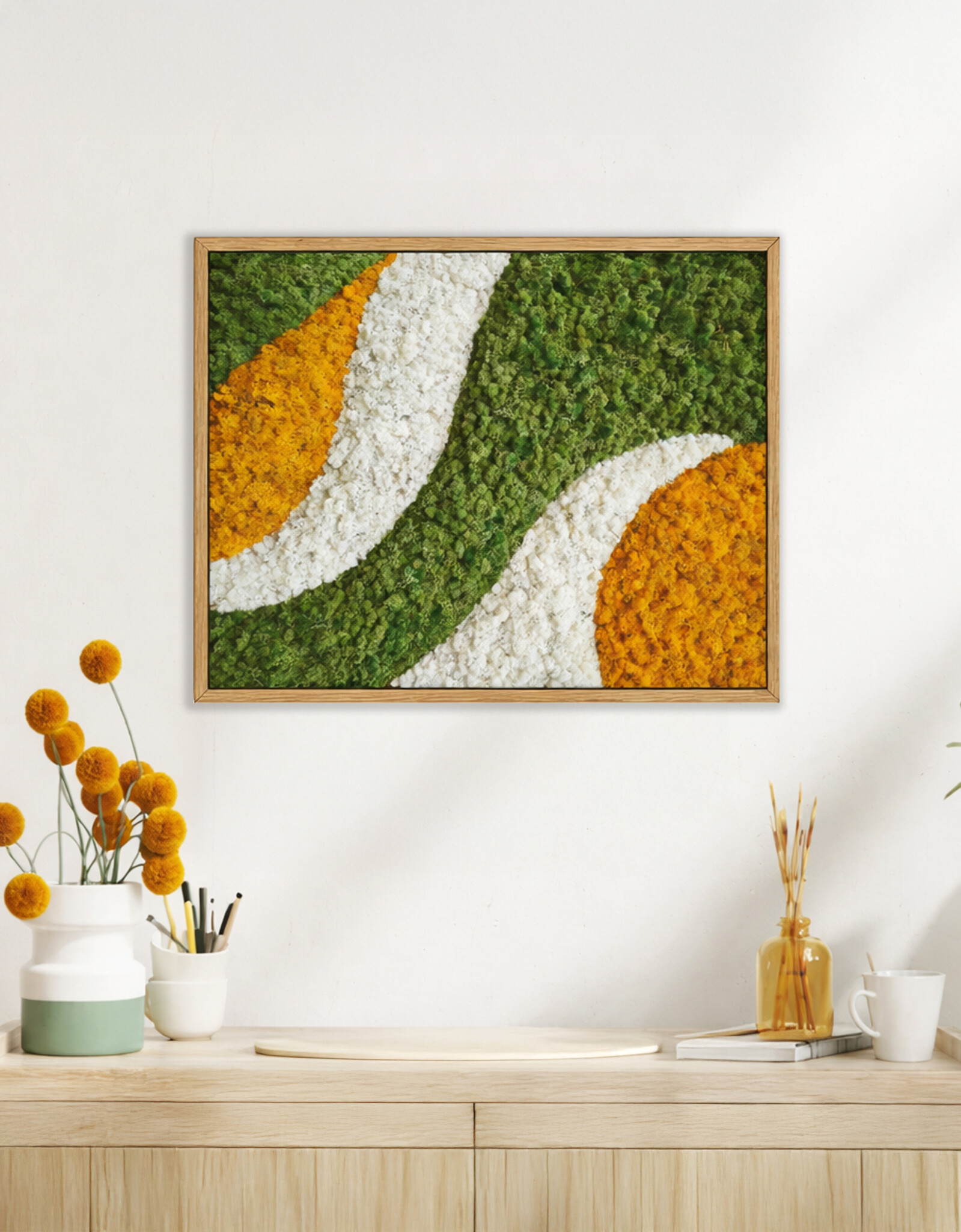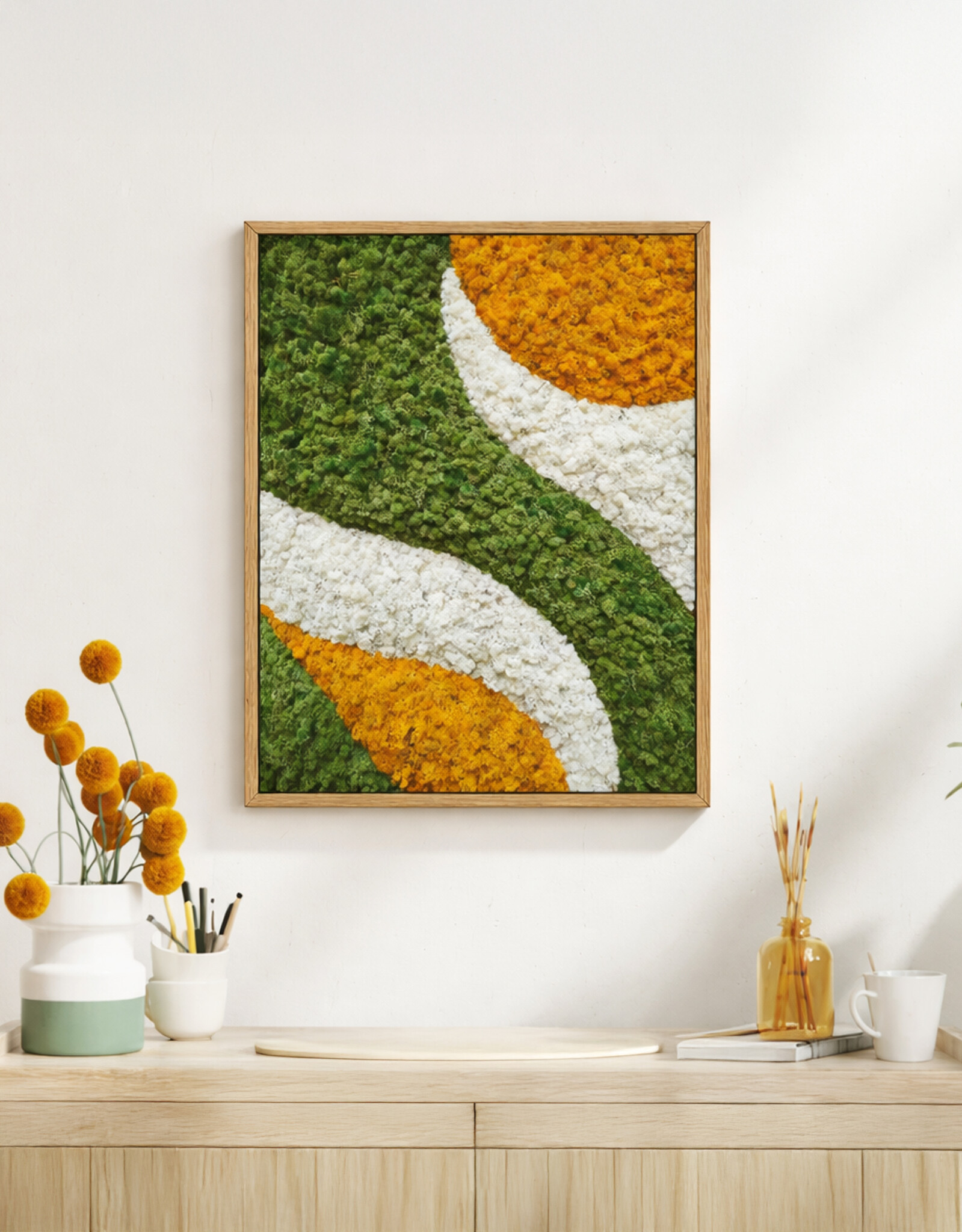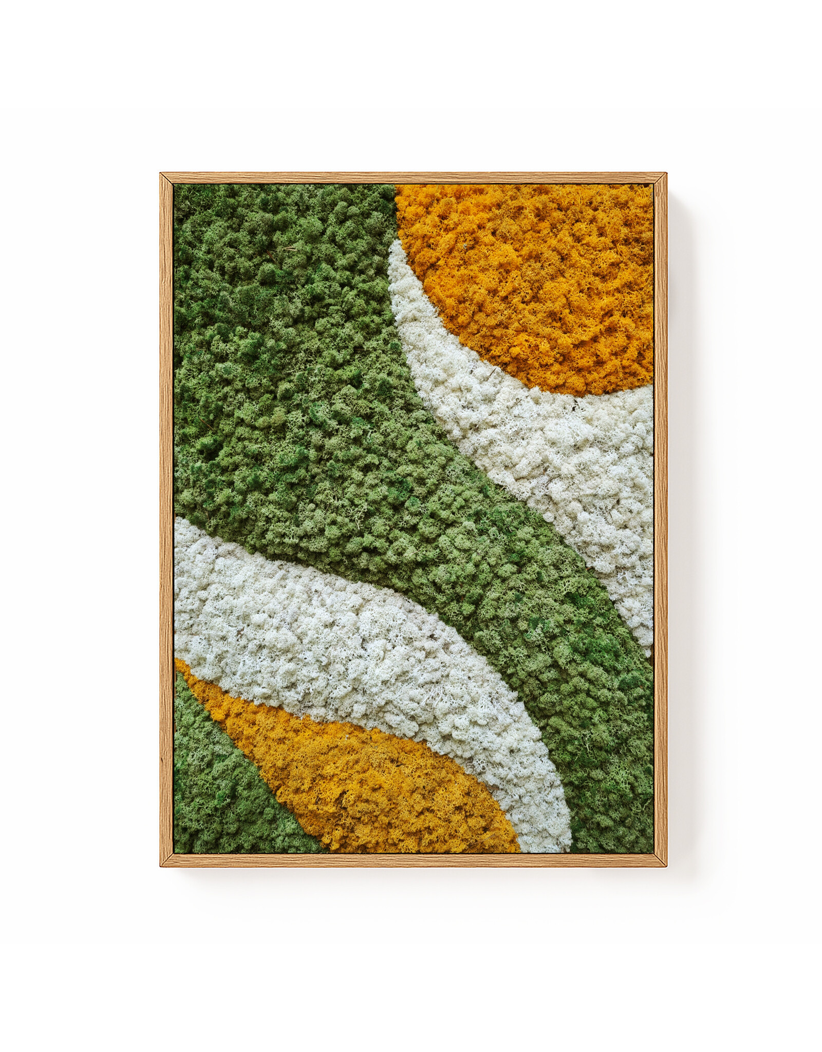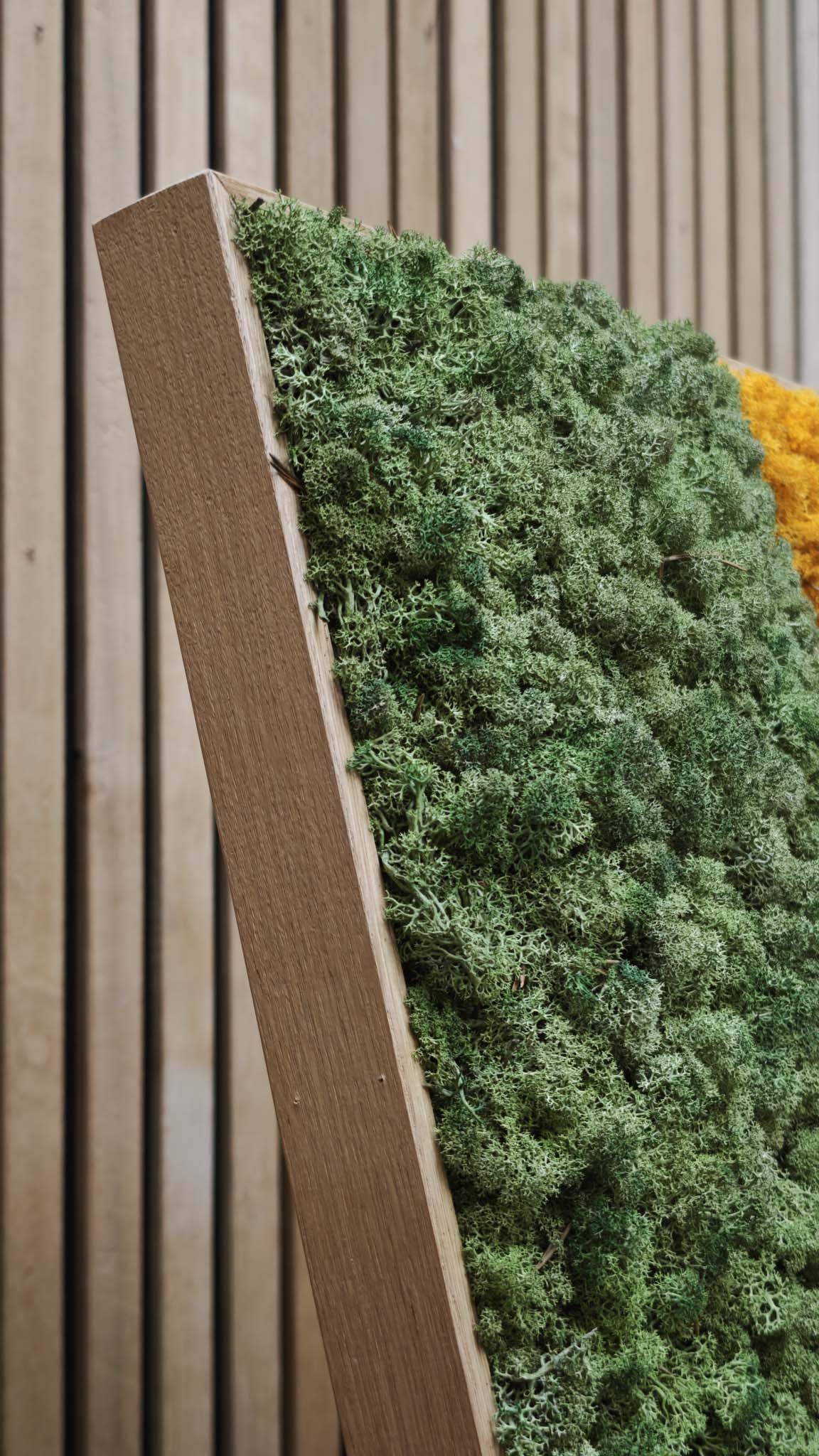 Ervaar de kracht van Japandi design, gemaakt van echt mos in een rustgevende compositie. Elk mosschilderij wordt met de hand gemaakt, is volledig onderhoudsvrij en direct klaar om stijlvol op te hangen. De strakke lijnen worden afgerond naar een andere moskleur, waardoor er een prachtig 3D-effect ontstaat dat diepte en karakter aan je interieur geeft.