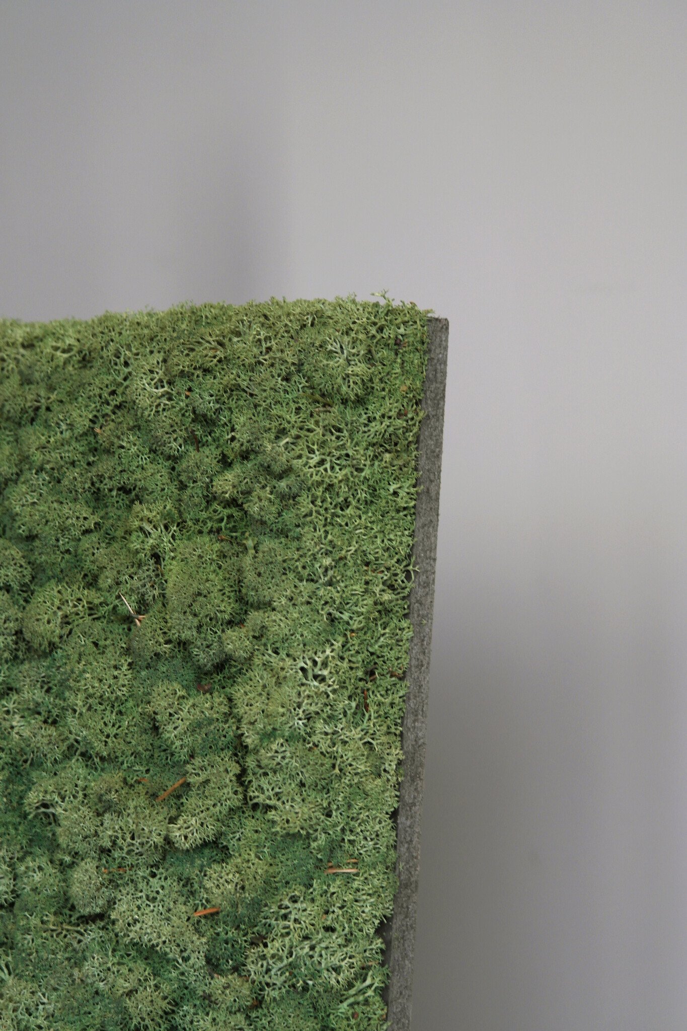 Het toegepaste mos is een 100% natuur product en heeft 0% onderhoud nodig. Een van de eigenschappen en voordelen zijn; hoge akoestische demping, brandvertragend (geïmpregneerd), zeer kleur vast, geen daglicht nodig, vuil afstotend (antistatisch) en omdat het mos niet meer leeft heeft het geen onderhoud nodig zoals water geven, snoeien of bemesten. De moscreaties zijn mooi en zacht om aan te raken en hebben een grote aantrekkingskracht. Onze mossen zijn van de hoogste kwaliteit wat zorgt voor een zéér lange levensduur (10-20 jaar).