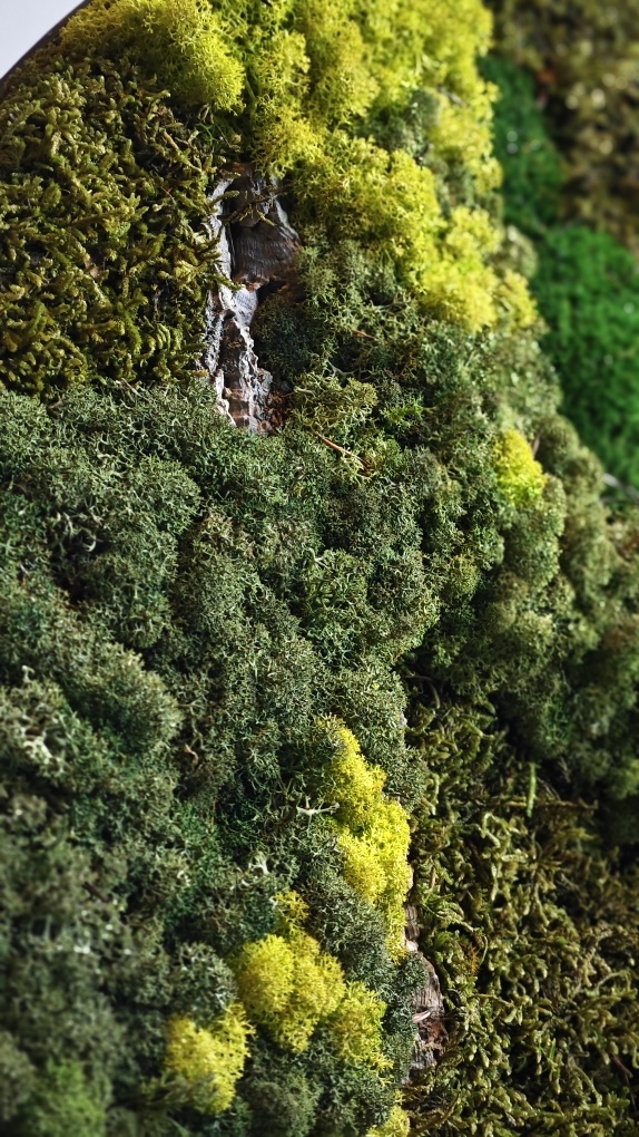 Dit is mosvariant Kaiju. Een mossenmix die bestaat uit rendiermos, platmos, bolmos en kurk. De kurk is roodbruin van kleur en bevat diepe groeven. Dit geeft het mosschilderij een interessante textuur en een natuurlijk contrast langs het zachte, weelderige groen van de mossen.
