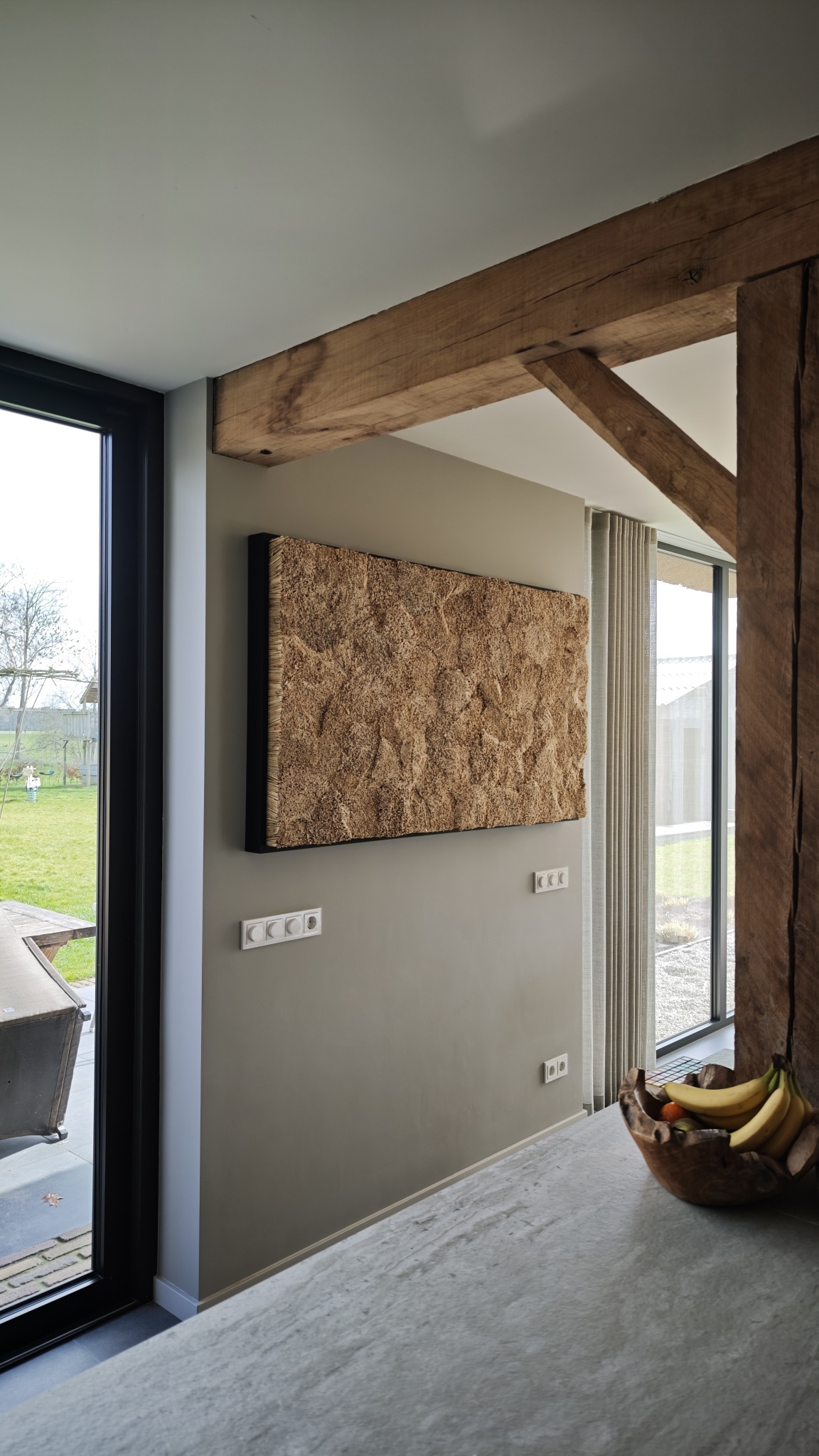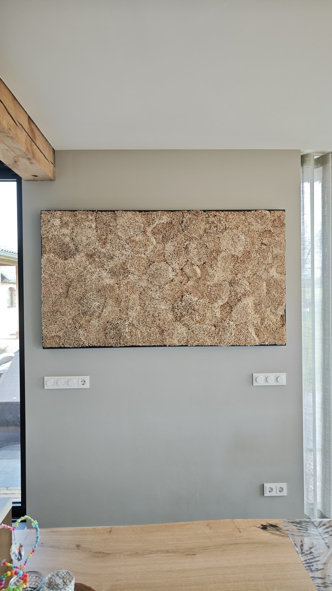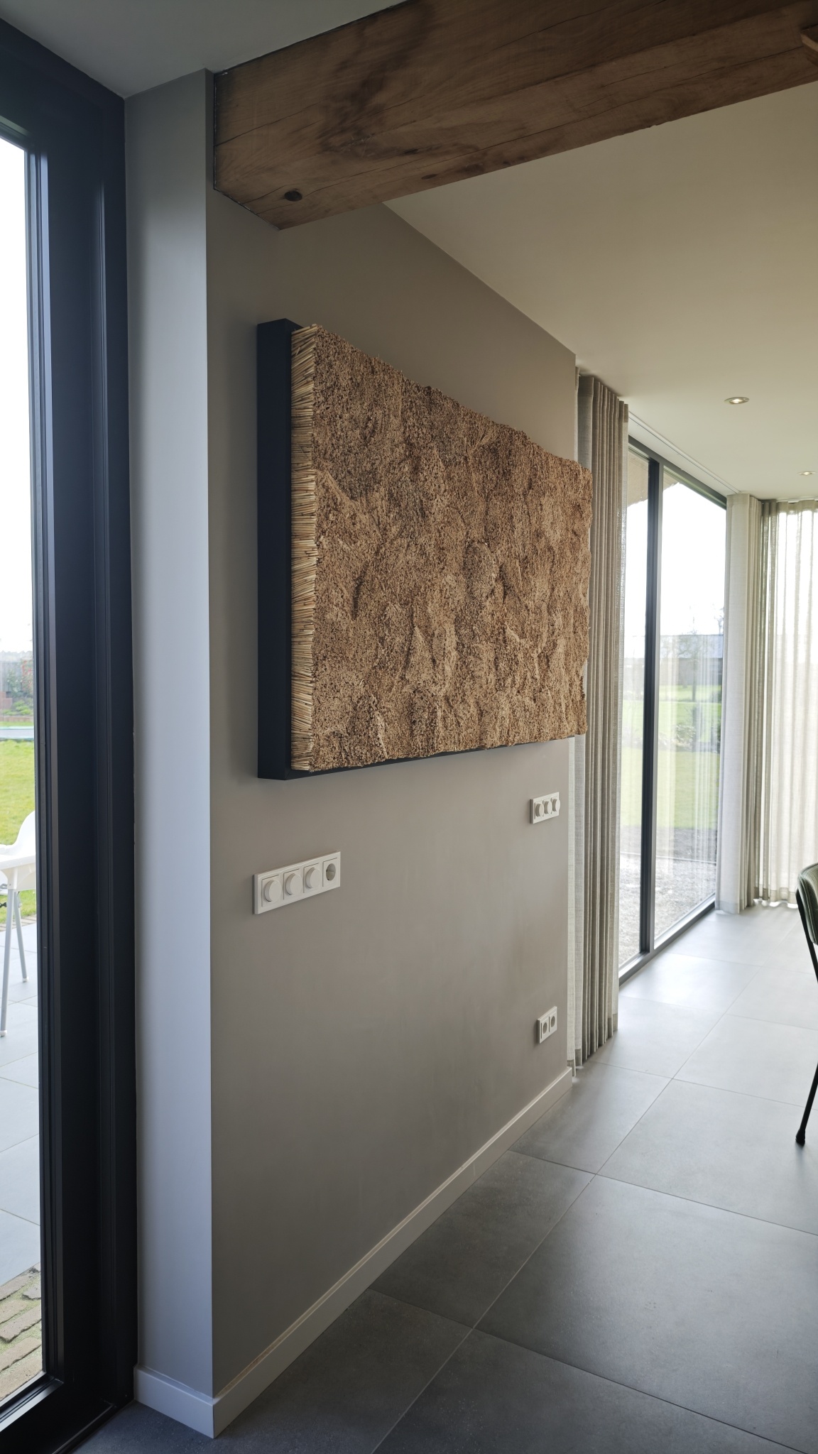 Combineer meerdere rietschilderijen als set om een indrukwekkende rietmuur te creëren. Dit geeft uw ruimte een natuurlijke en duurzame sfeer. Het gebruik van Hollands riet zorgt voor een warme en rustieke uitstraling, die niet te vergelijken is met een traditioneel schilderij. Bovendien dempt het riet effectief geluid en verbetert dit de akoestiek in de ruimte.