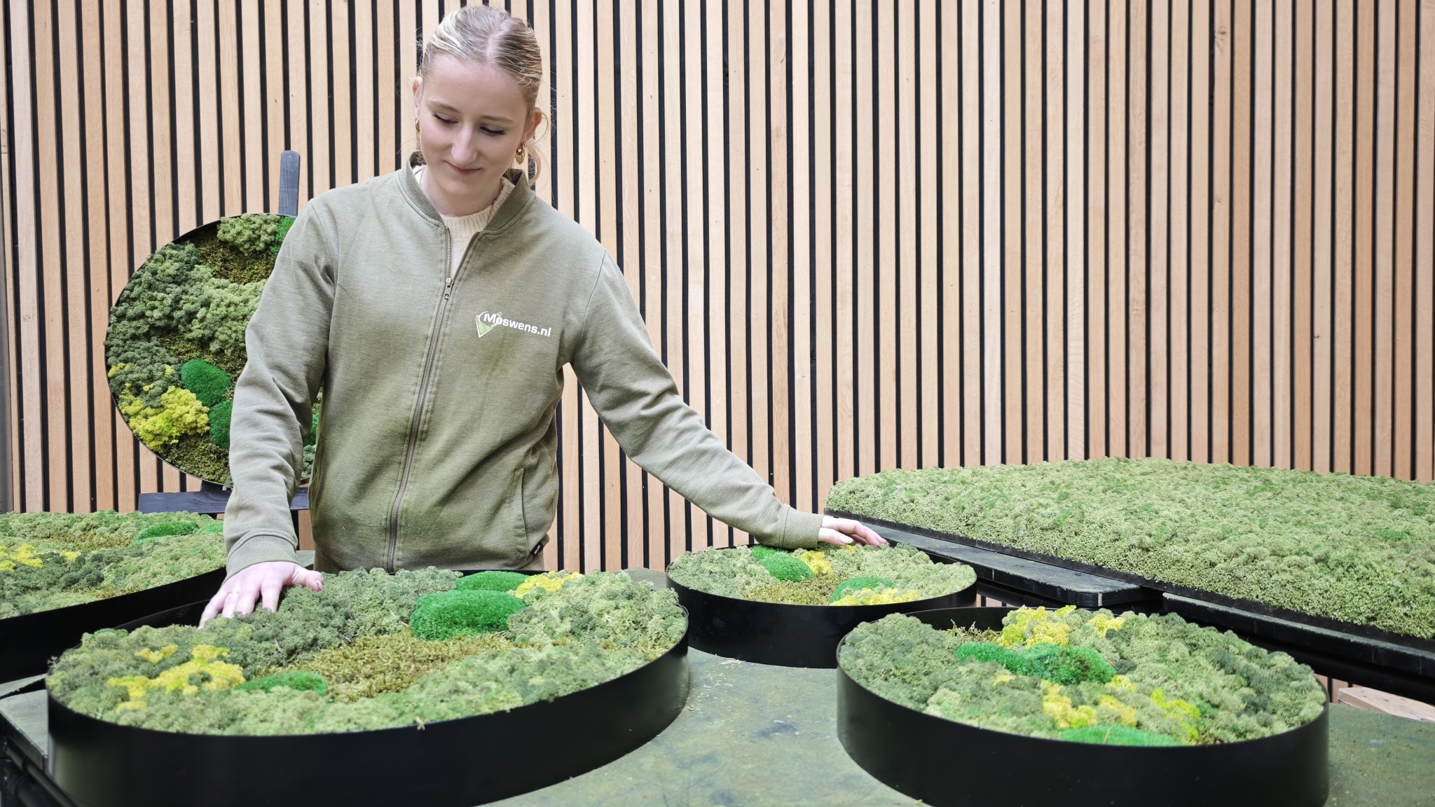 Vervolgens begint het meest kenmerkende deel van het proces, het aanbrengen van het mos. De geselecteerde mossoorten worden met de hand geplaatst en zorgvuldig verdeeld over het paneel. Eerst wordt de basis gelegd met platmos, dat zorgt voor een rustige en egale ondergrond. Daarna worden andere mossoorten, zoals rendiermos of bolmos, toegevoegd om het mosschilderij meer diepte en karakter te geven.